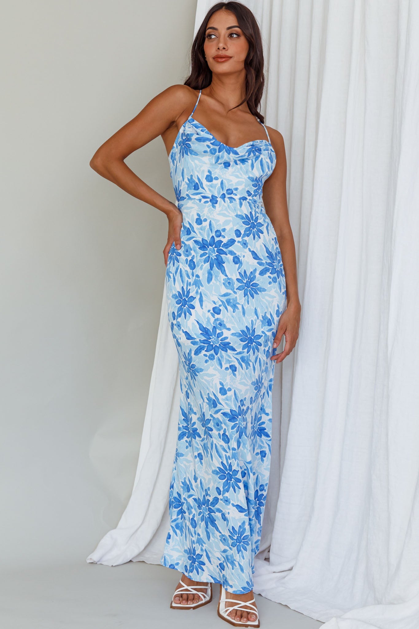 We are head over heels for our chic Janaina maxi dress. Featuring a cowl neck and a strappy back. It's perfect for sunset happy hours with your besties. Team it with strappy, white heels and hoop earrings for an on-trend look we are loving.