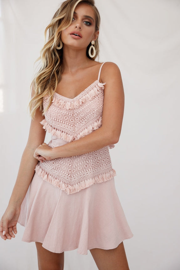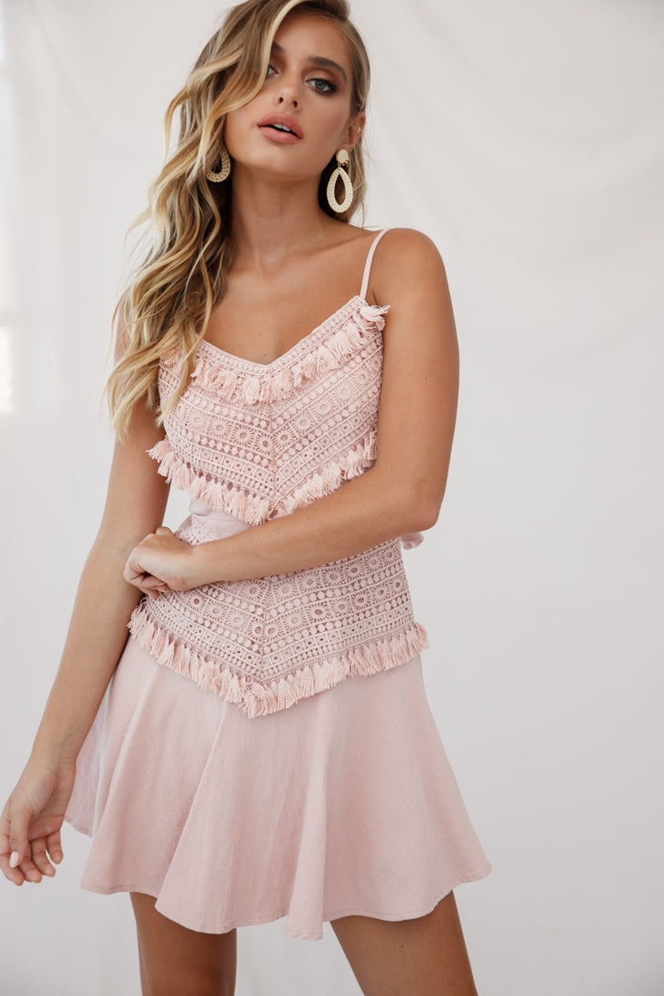 Make a statement in this unique, A-line dress featuring tassel-trimmed appliqué embellishment, tie-back fastening and spaghetti straps. Perfect for a movie date with bae or brunch with the gals. Team it with strappy nude heels and gold hoop earrings and get ready to turn heads.