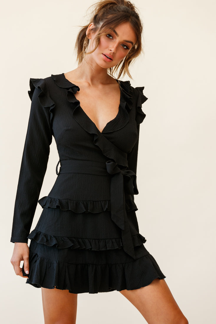 Sugar couldn't make you any sweeter in our adorable Jemirah dress. Featuring a ruffle-trimmed surplice neckline, long sleeves, ruffle shoulders and tiered frill detail in the skirt. Perfect for Sunday Brunch and mimosas with your bff's teamed with boots and gold hoop earrings.