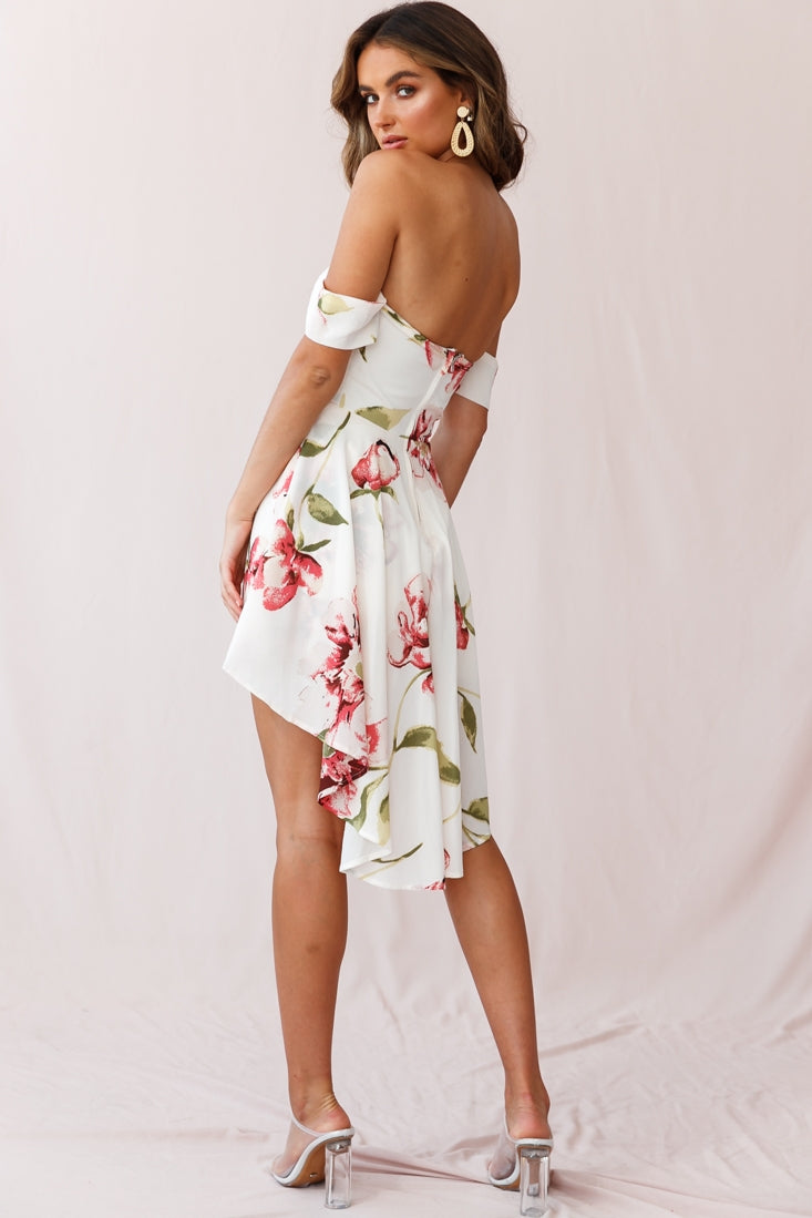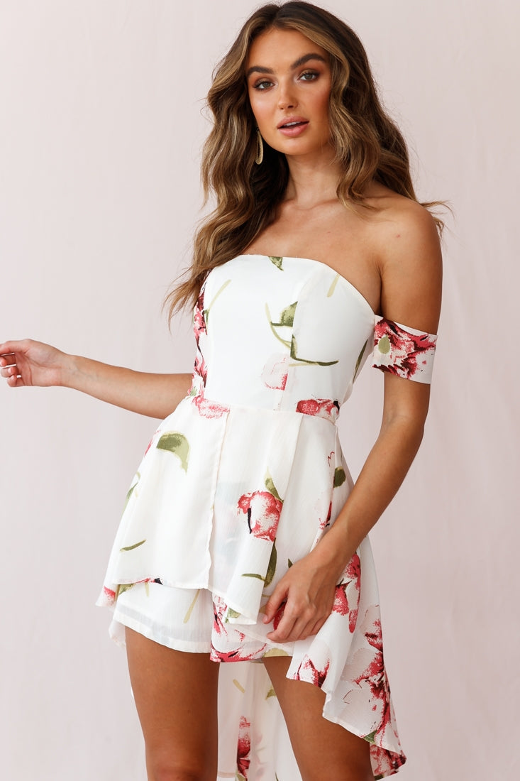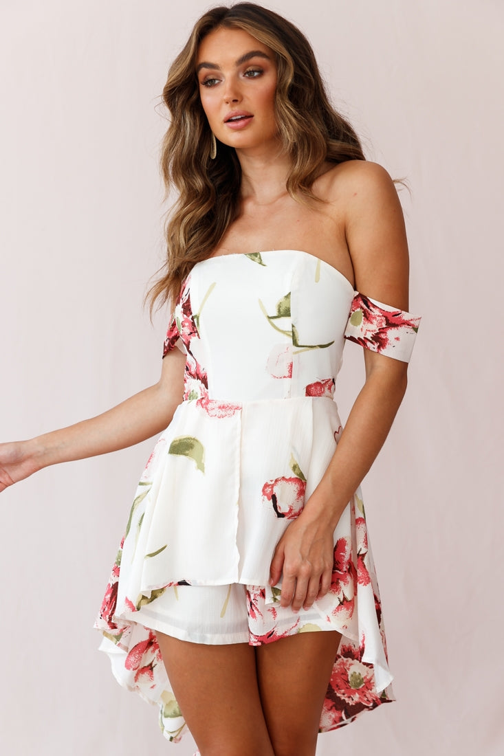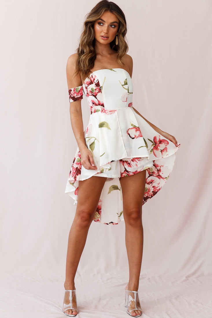 Pretty as a picture! This off-the-shoulder, high-low romper features breezy fabric in a stunning floral print. Perfect for a garden wedding or lunch with your ladies! Pair with nude pumps and delicate jewelry for a super chic, feminine look.