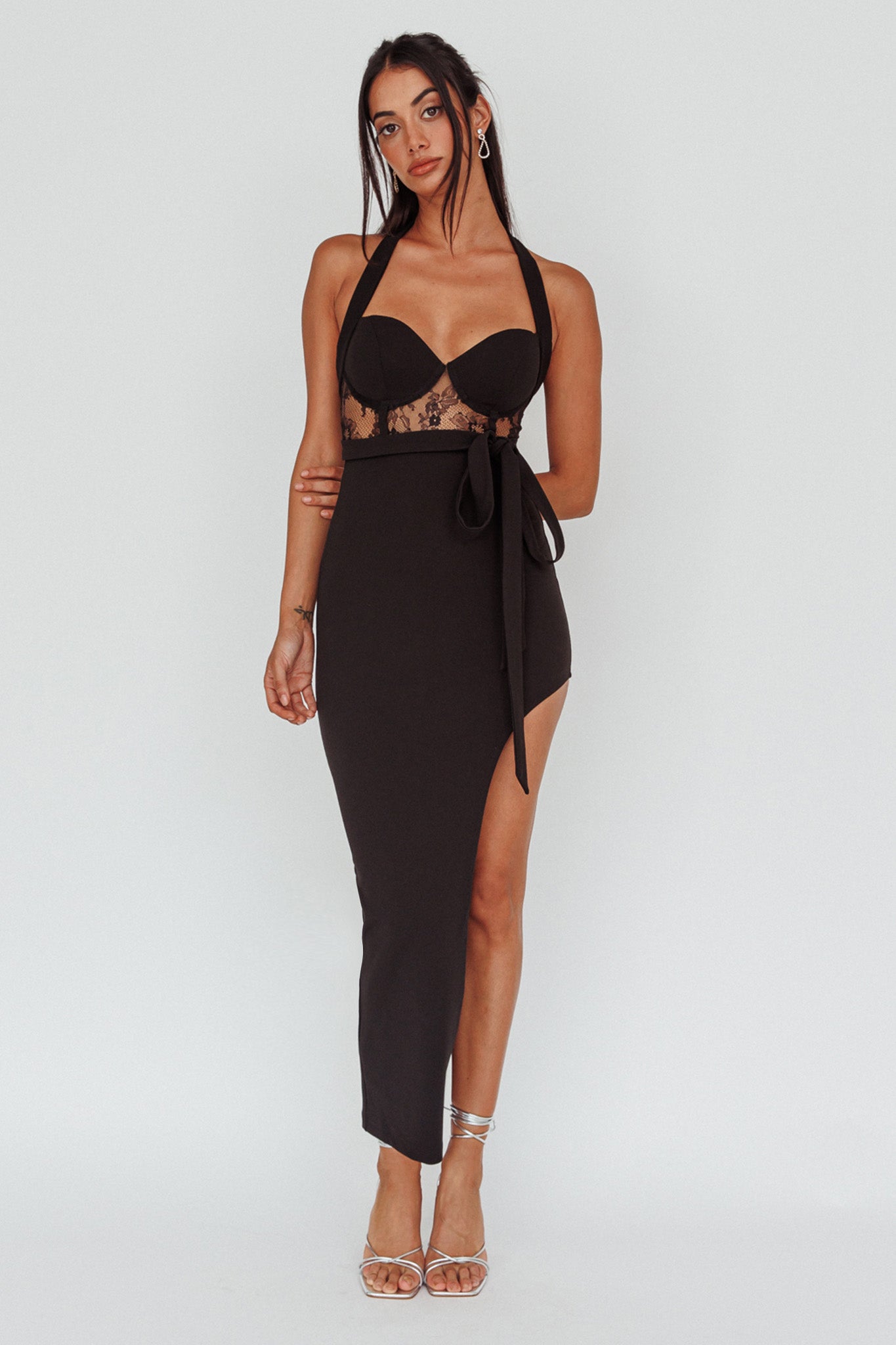 You will steal the show in our gorgeous Jonetta midi dress. Featuring lace in the bodice and a thigh-high side split. It's perfect for any special event teamed with strappy, black heels and a clutch for an unforgettable look.