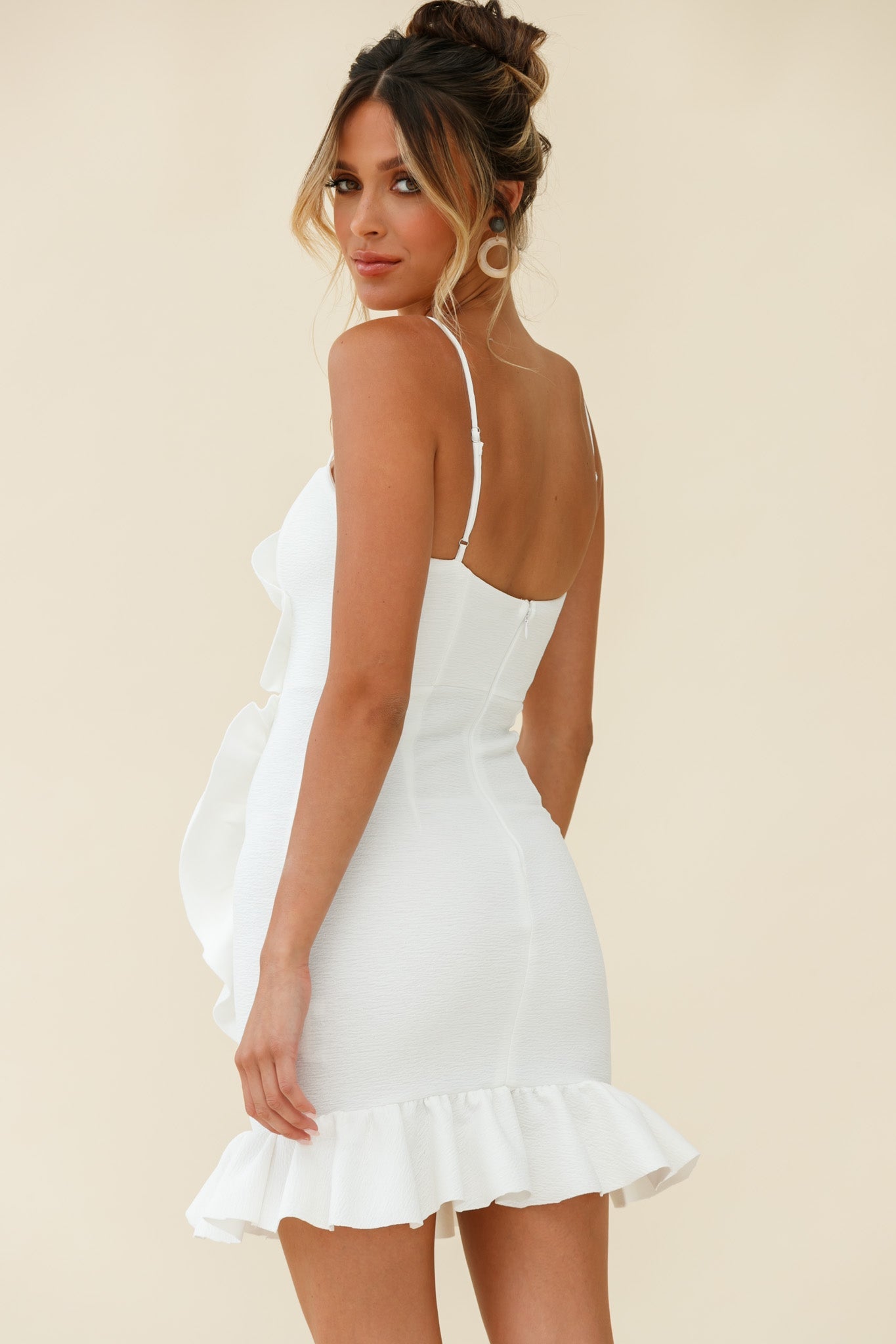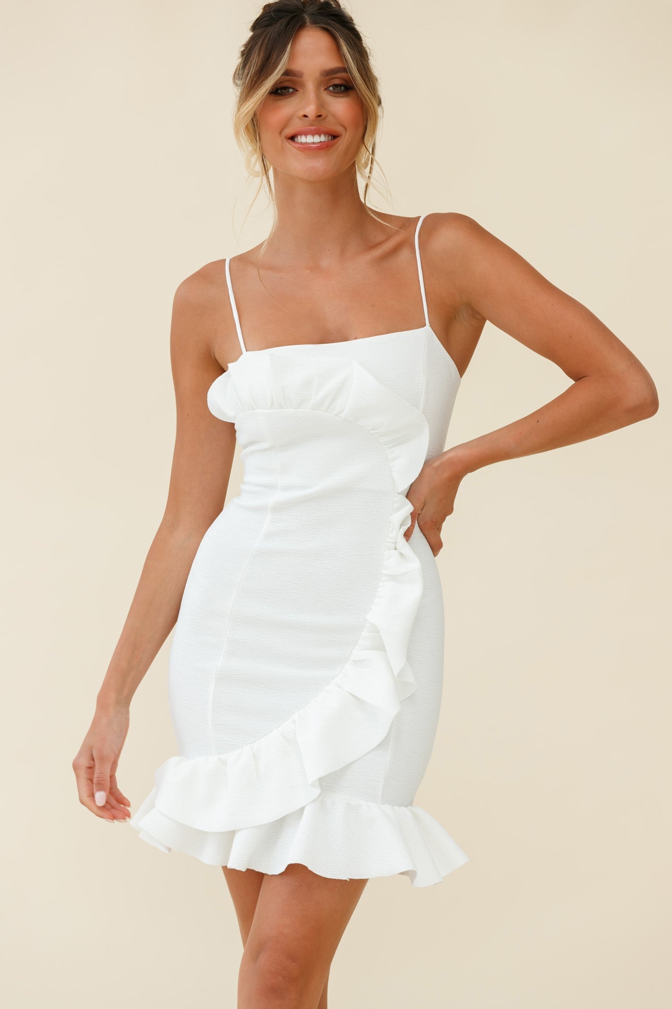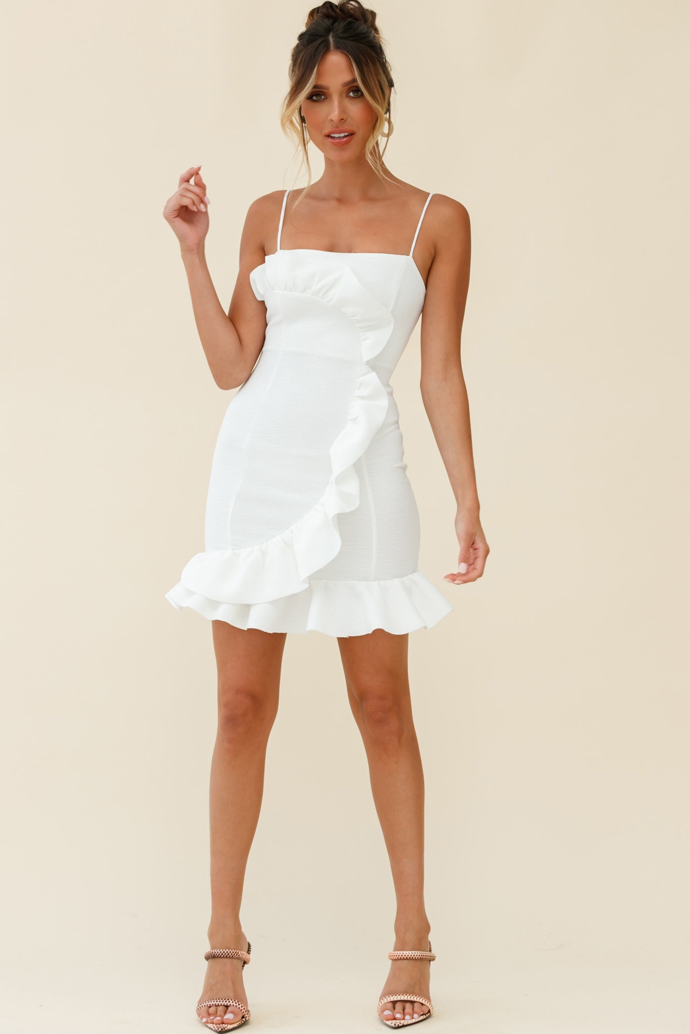 You'll be getting all the attention in our elegant Juanita dress. Perfect for a cocktail party or special birthday occasion. We are loving that half moon ruffle detail in the front and bodycon silhouette. Team it with some nude, strappy block heels and a clutch for an elegant look we are loving.