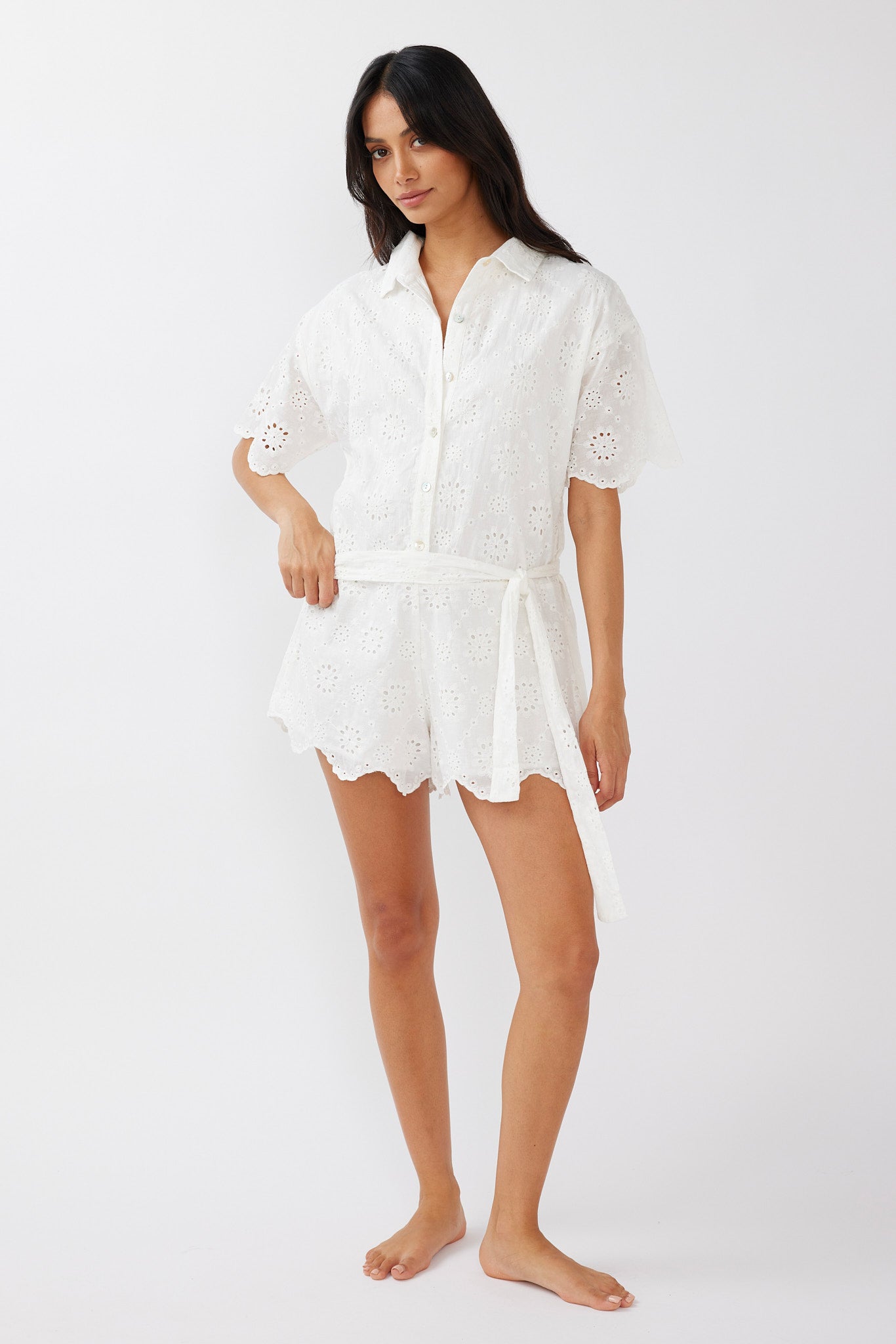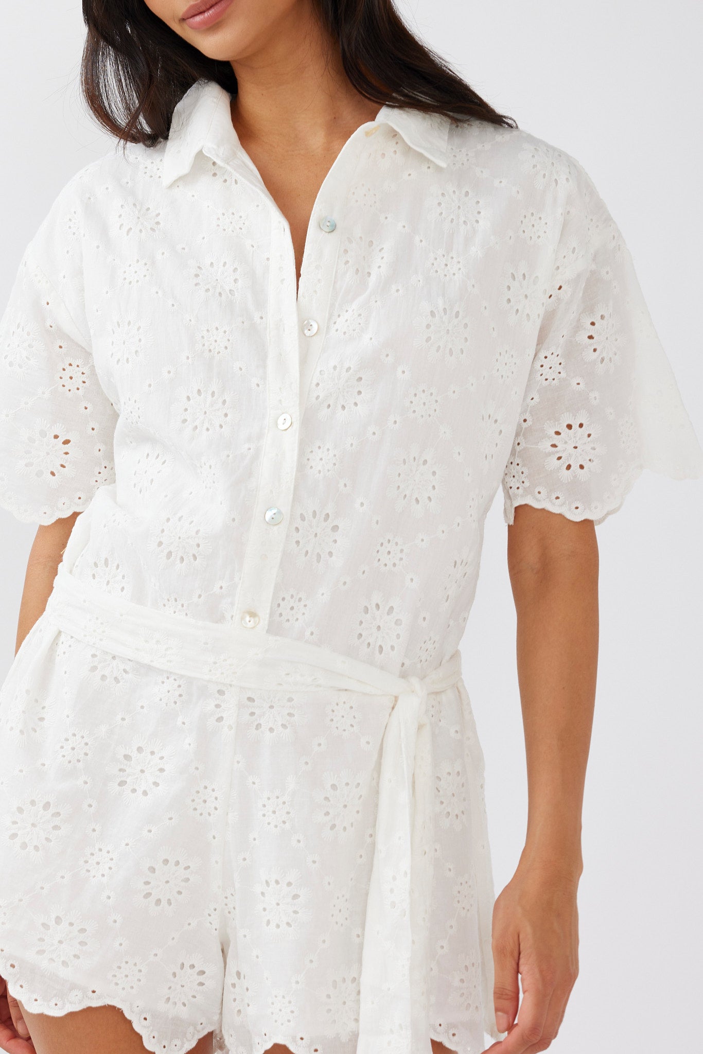 Breeze through your weekend in our gorgeous Junie romper. We are in love with its pretty eyelet embroidery fabric and scalloped hem. Perfect for weekend lunch dates with your besties teamed with mules and a tote for a look we've fallen in love with.
