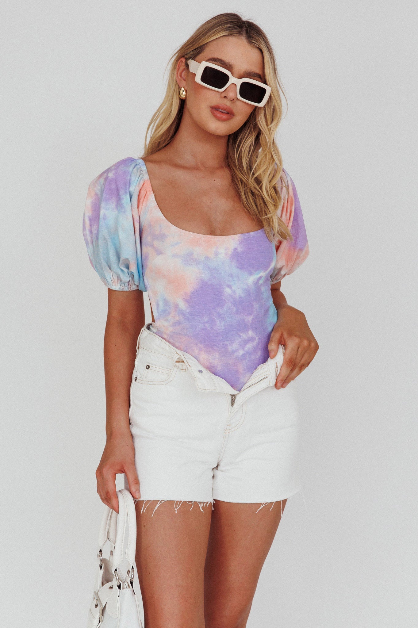 Just A Glimpse Puff Sleeve Open Back Bodysuit Tie-Dye Purple/Blue