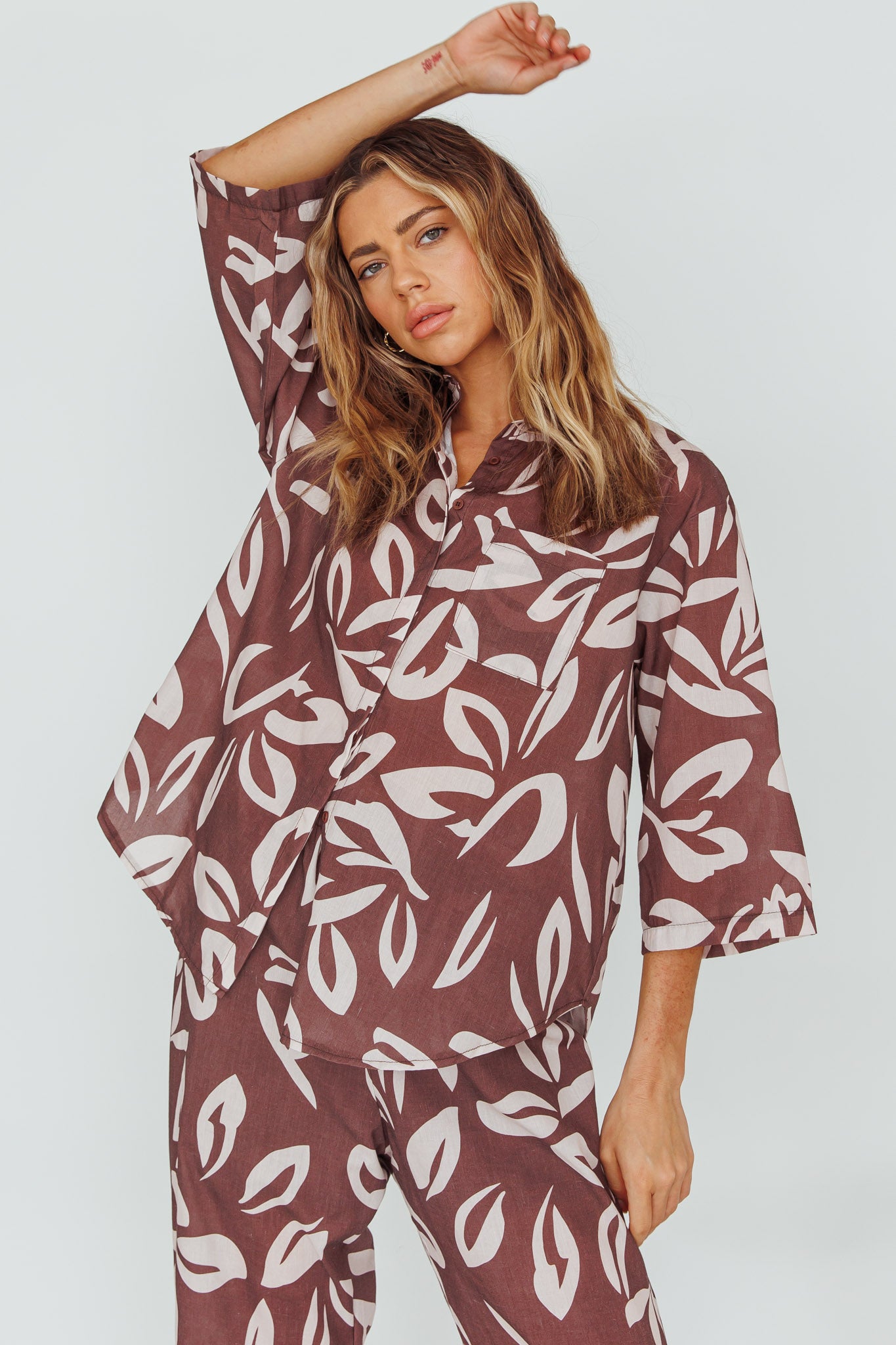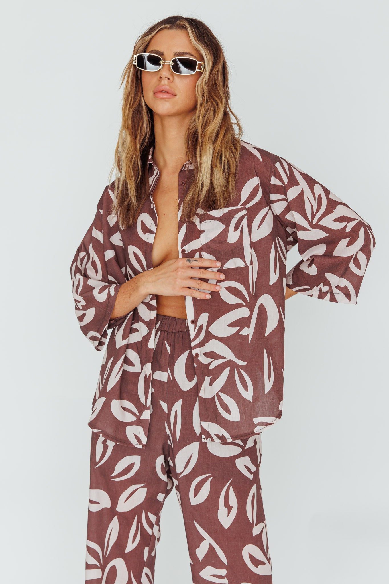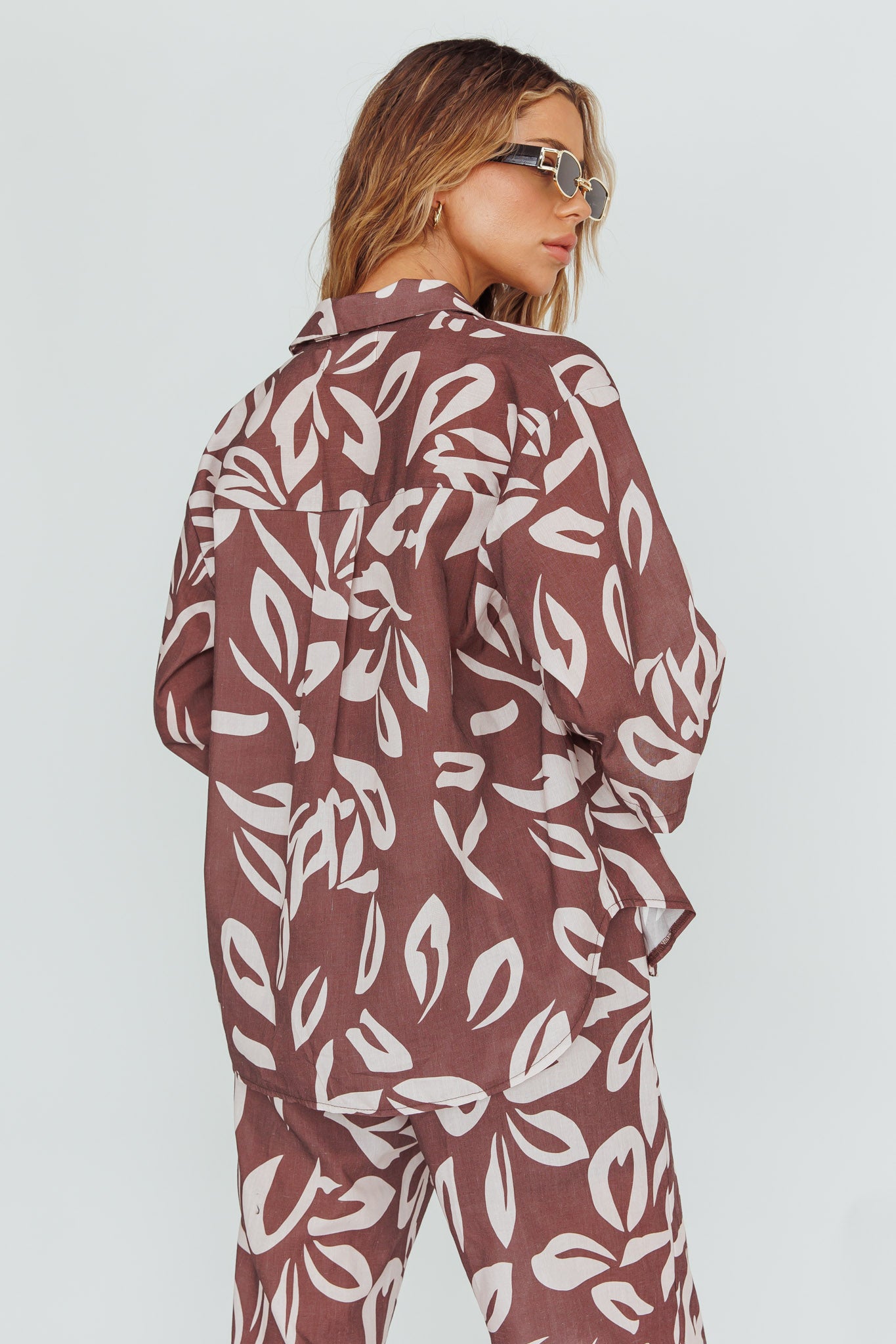Just A Hunch Button Shirt Leaf Print Chocolate