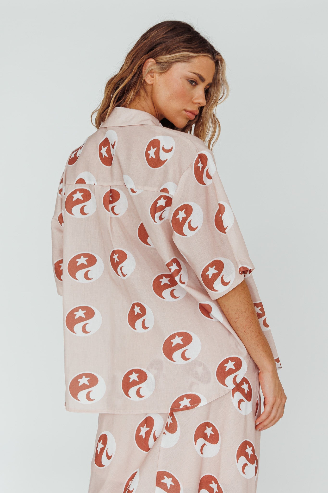 Hey there, cutie! We are loving the print on our Just A Hunch shirt. Perfect for weekend brunch dates with your besties, it looks super cute paired with its matching skirt or wear it with denim shorts and mules for a look we are loving.