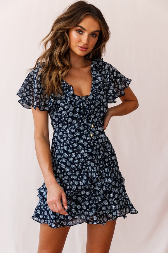 Hey there, cutie! You are doing everything right in our ultra cute Kalina dress. Featuring a ruffle-trimmed, string-tie neckline, flutter sleeves and ruffle-trimmed hemline. Perfect for a day at the mall, teamed with tennis shoes and a round, woven bag. Loves it!