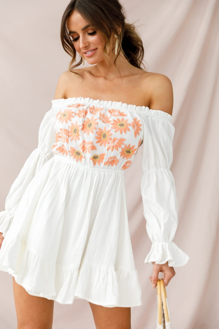 Kayla Off-Shoulder Daisy Embroidered Dress White
