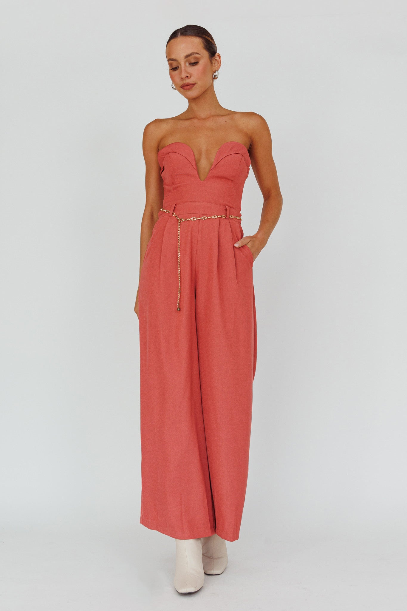 Kayte Strapless Belted Waist Jumpsuit Rose