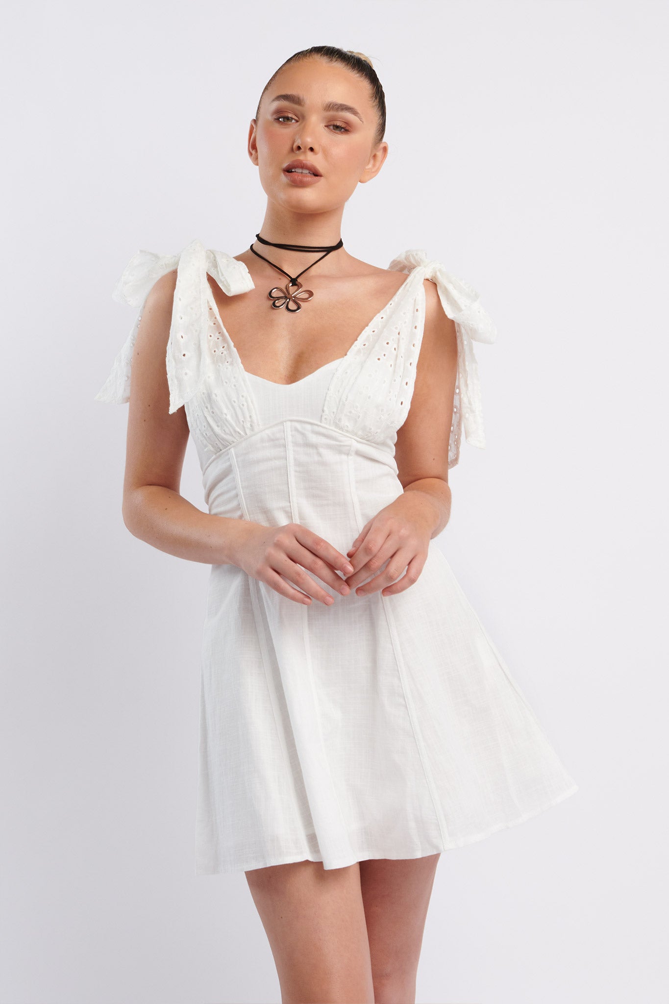 Kellie Bow Shoulder Mini Dress White
