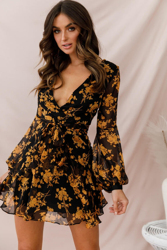 Wedding? Cocktail party? This pretty dress has you covered. With its on-trend ruffles, long balloon sleeves and flattering, faux-wrap neckline, you'll be turning heads every where you go. Pair it with single strap black heels or ankle boots for a look we are loving.