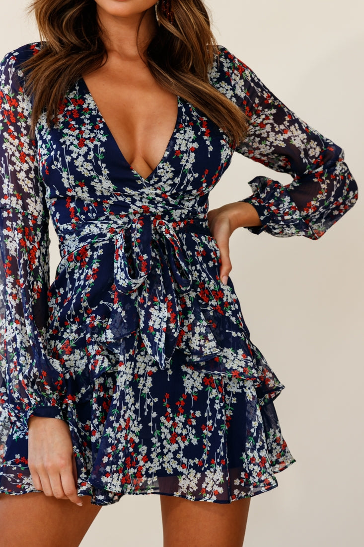 Kerry Layered Balloon Sleeve Dress Floral Vine Print Navy