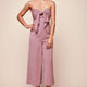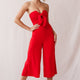 Dainty jumpsuit with some edge! This strapless number with bow tie along the bust. Wide leg trousers bring an added "je ne sais quoi"