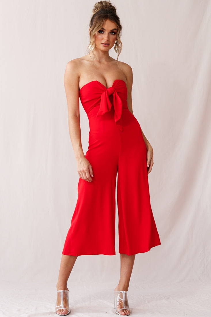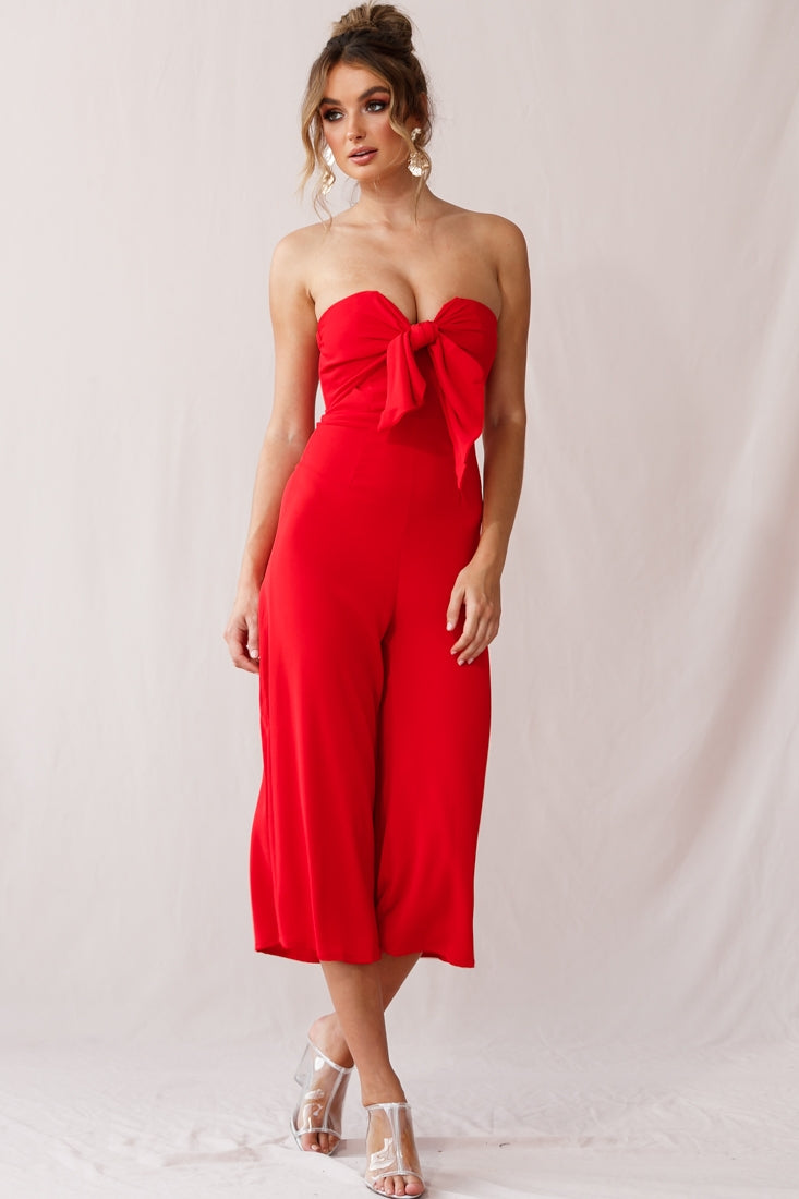 You'll be turning heads in this super cute jumpsuit. Featuring a soft fabric throughout, a sweetheart neckline with tie over the bust, invisible back zipper and trendy wide-leg pants. Team it with nude pumps and gold hoop earrings for extra style points. Get it, girl!