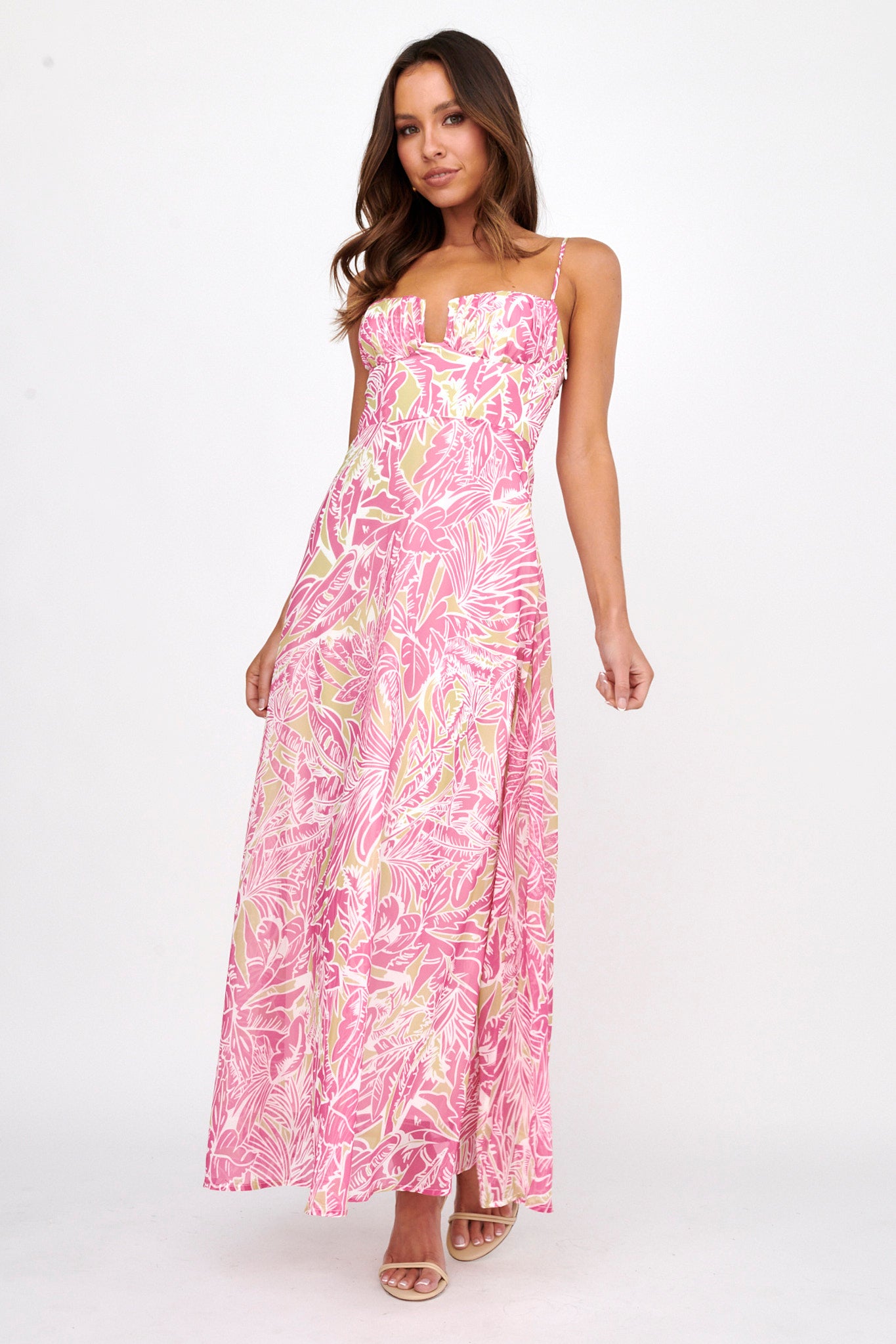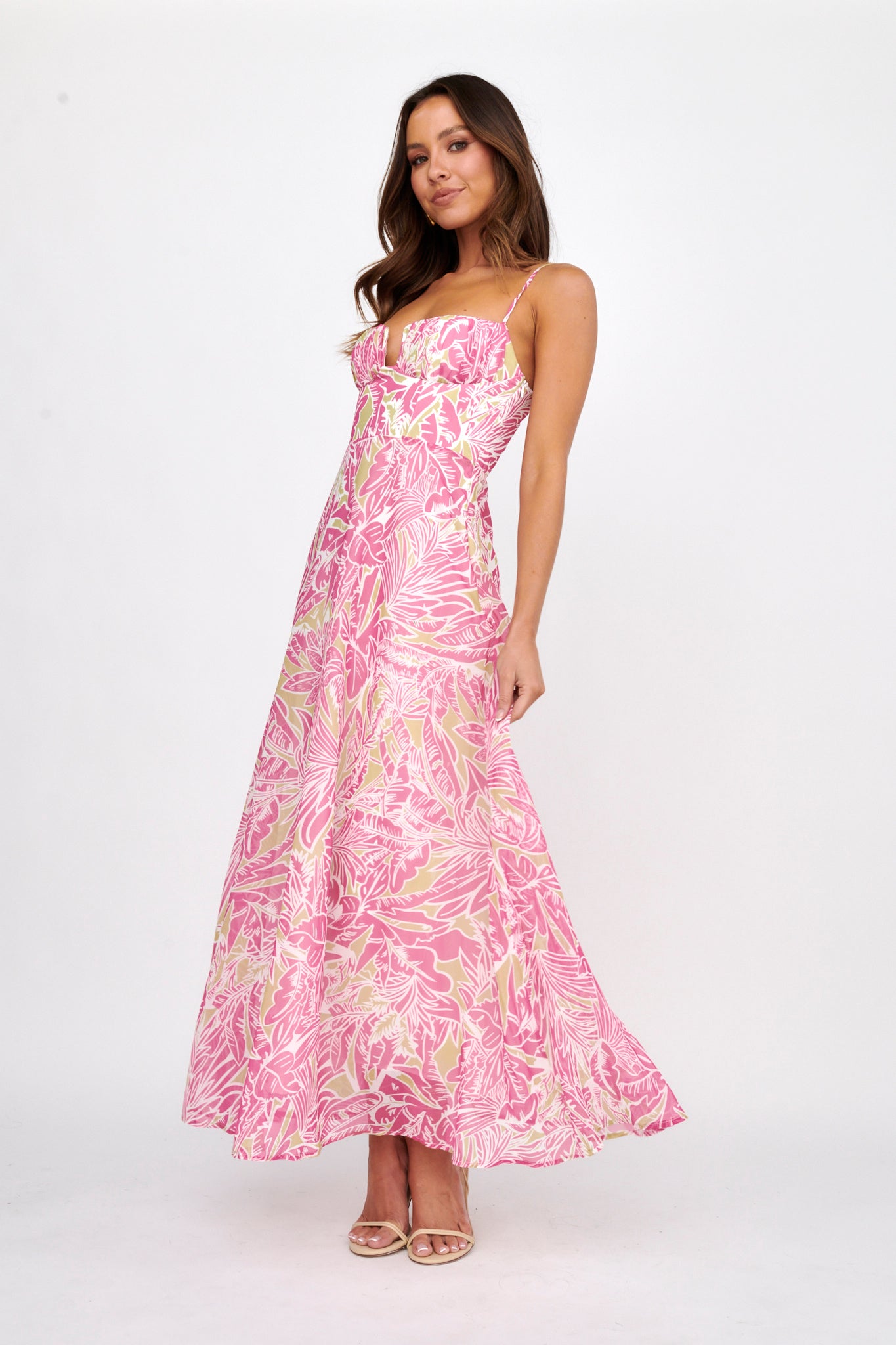 Twirl your night away in our chic Kindred Love maxi dress. Featuring a pretty, leaf print, it's perfect for a romantic dinner date with your lover. Team it with tan mules and a tote for a look we are loving.