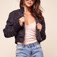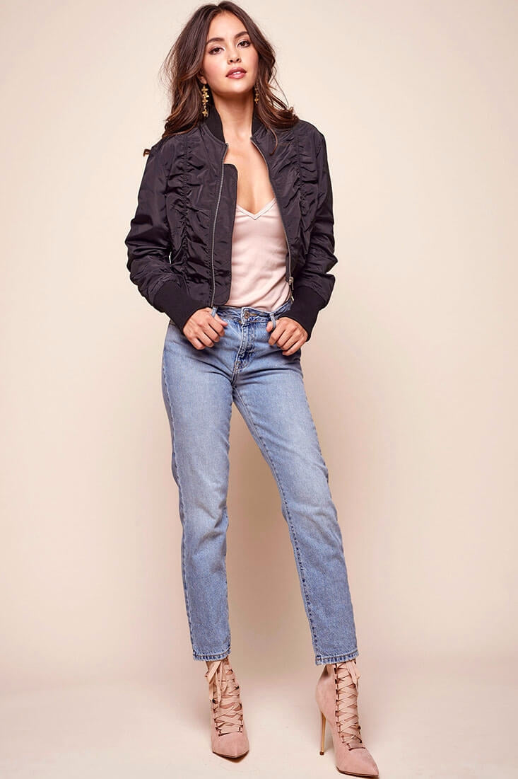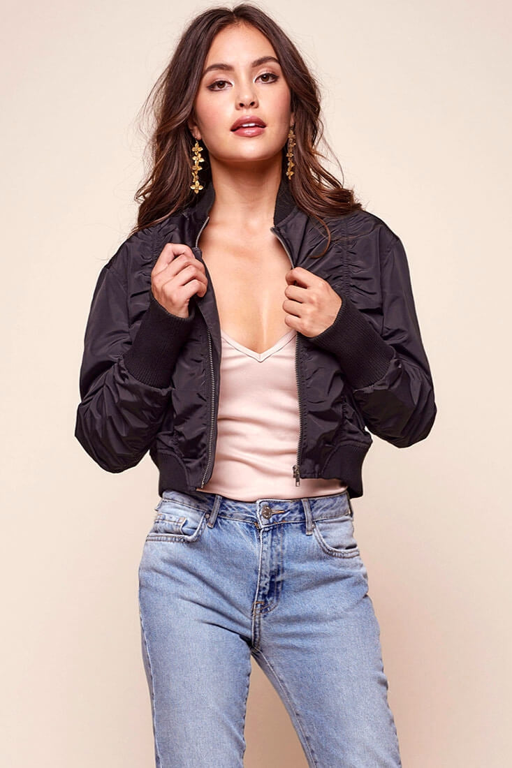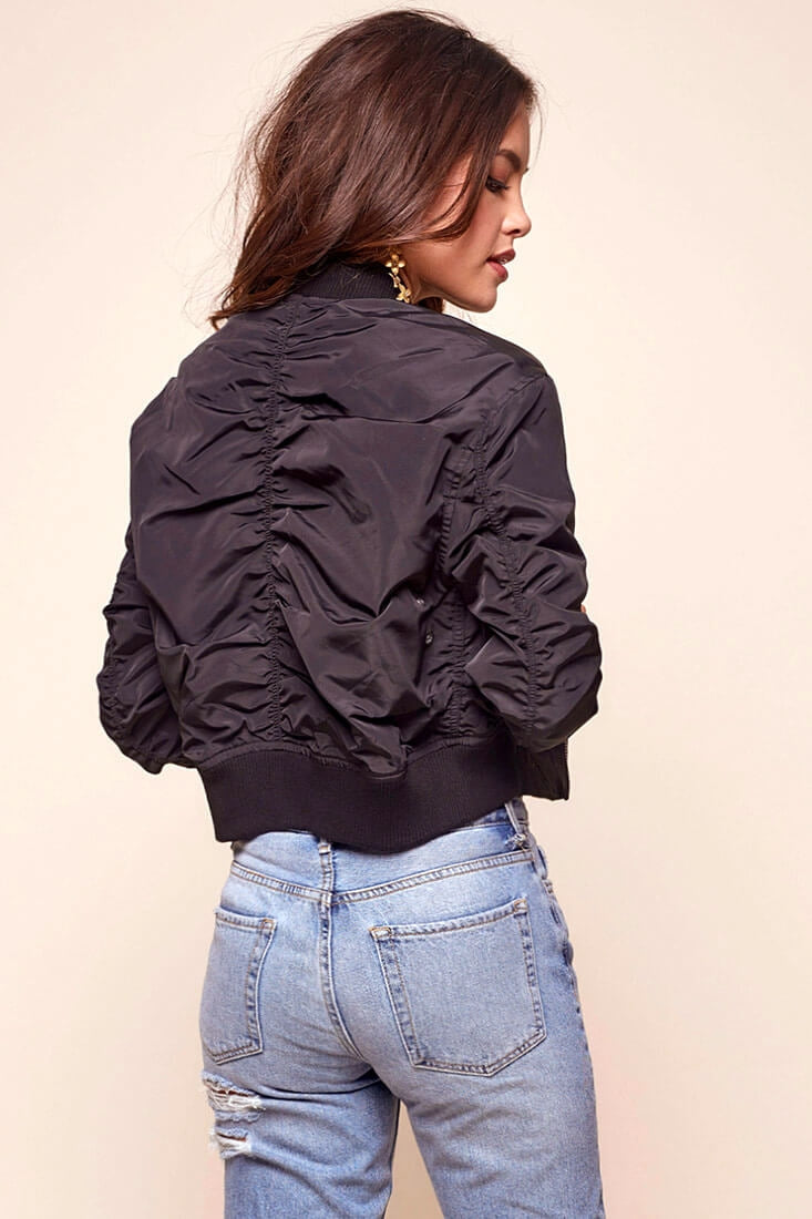 Bad girls link up! This edgy bomber jacket with fun ruching is the piece that you'll rock through fall and winter. Pair with lace up boots and a sassy attitude.