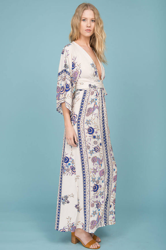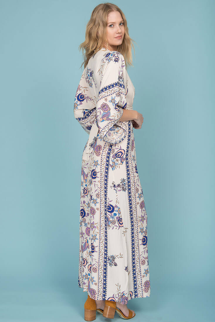 Boho Babe! The Kira Zip Up Maxi Dress with Deep V and wrap waist. this dress is a vacation staple! Wear with white sandals and aviator sunglasses.