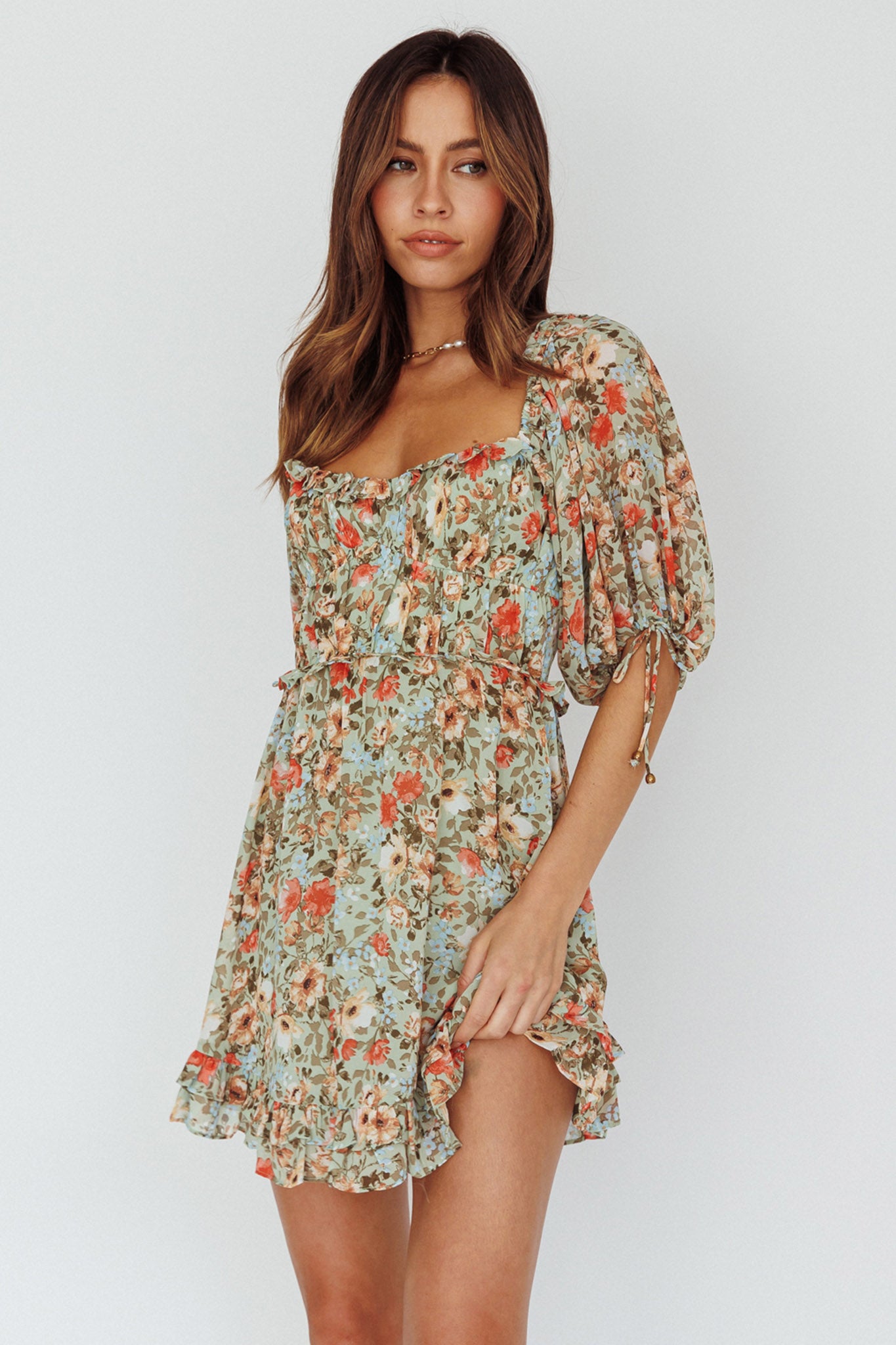Kirra Puff Sleeve Ruched Bodice Dress Floral Green