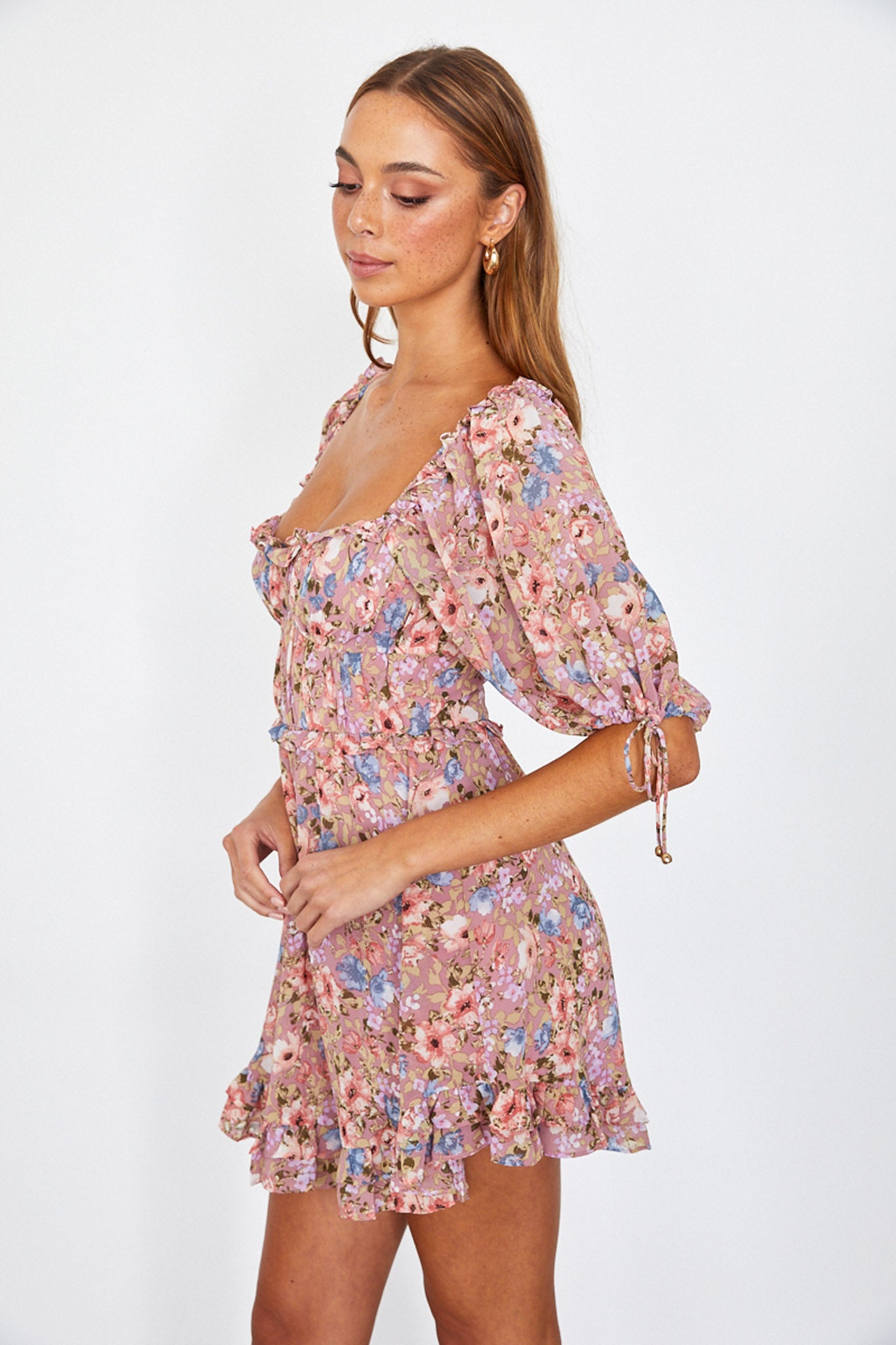 Kirra Puff Sleeve Ruched Bodice Dress Floral Pink