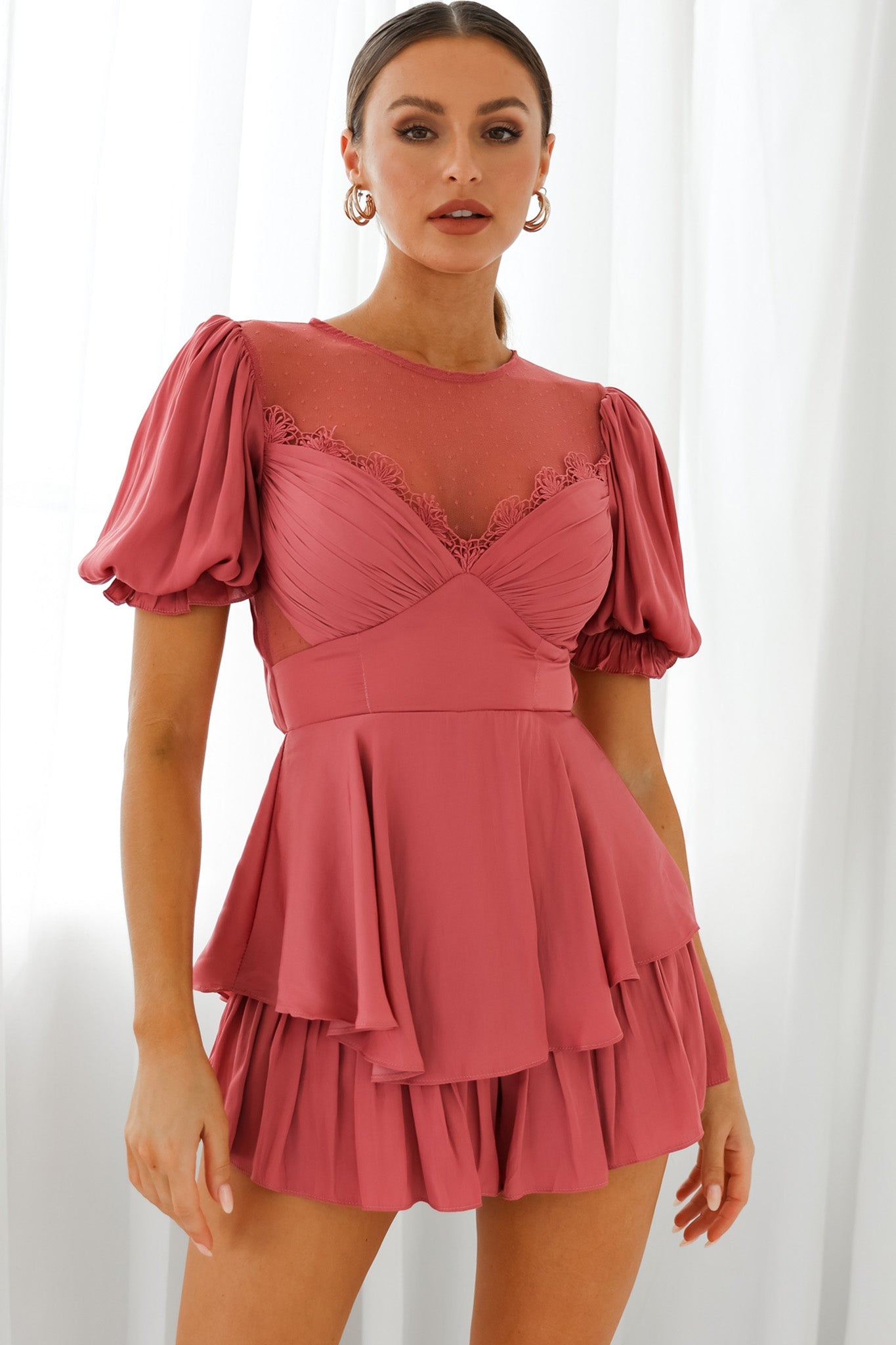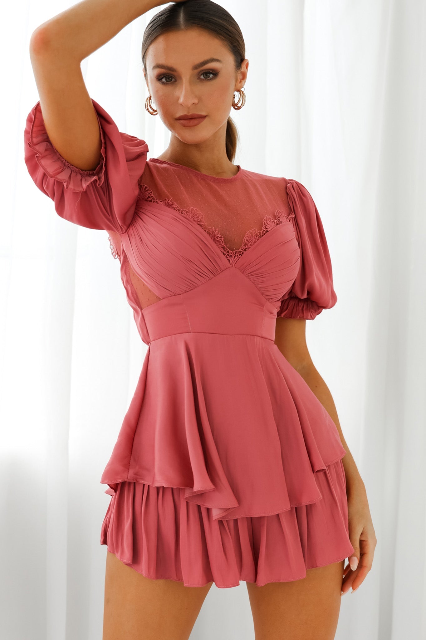L'amour Lace Mesh Bust Puff Sleeve Romper Rose