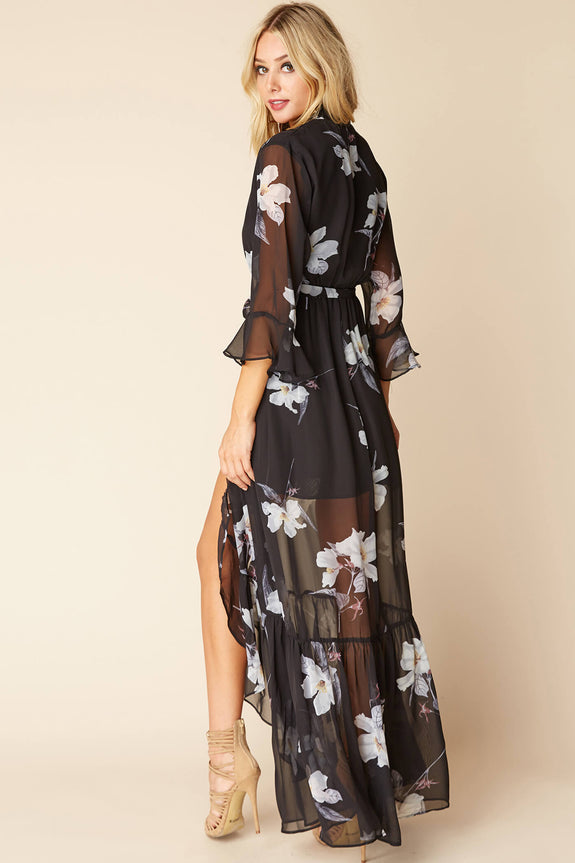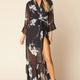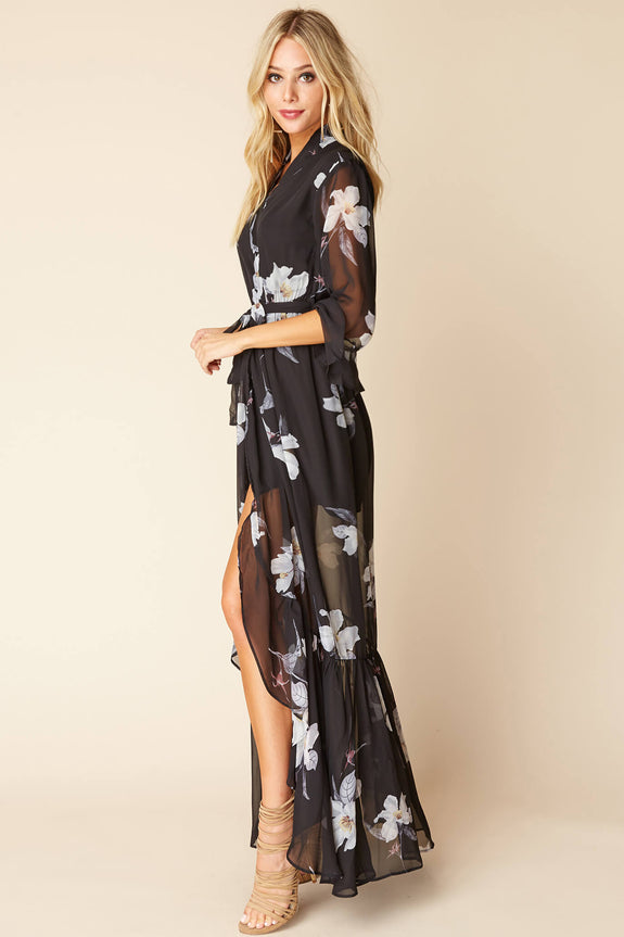 Kimono inspired wrap dress with gorgeous floral print. Sport over a white bikini as a cover up or wear over your LBD for a fun club night.