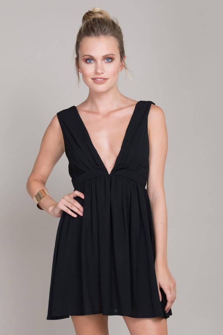 Romantic LBD gains new life with low cut neckline and playful hemline. Play up the look with tall black heels.