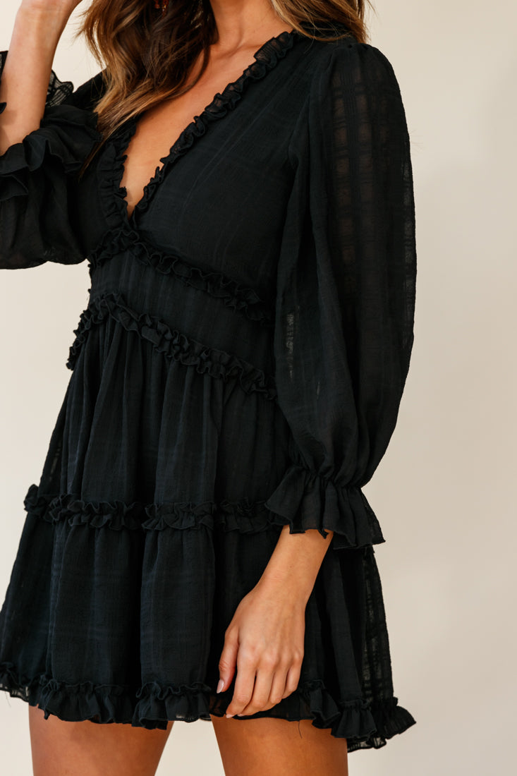 Laney. She's ALL that. And you will be too in this super cute dress featuring three-quarter balloon sleeves, a delicate ruffle trim around the skirt, torso and neckline and our favorite part: the most adorable cutout back feature trimmed with the same pretty ruffle detail echoed throughout the dress. The fabric is soft and floaty and there's a lining under the skirt and bust for modesty. Wear it on a girl's night out with strappy nude heels or ankle boots for a look we are loving.