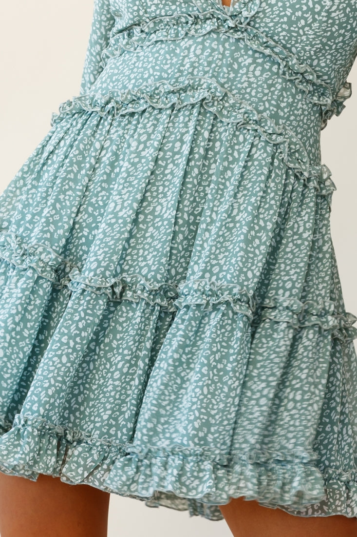 Laney. She's ALL that. And you will be too in this super cute dress featuring three-quarter balloon sleeves, a delicate ruffle trim around the skirt, torso and neckline and our favorite part: the most adorable cutout back feature trimmed with the same pretty ruffle detail echoed throughout the dress. The sheer chiffon is soft and floaty and there's a lining under the skirt and bust for modesty. Wear it on a girl's night out with strappy nude heels or ankle boots for a look we are loving.