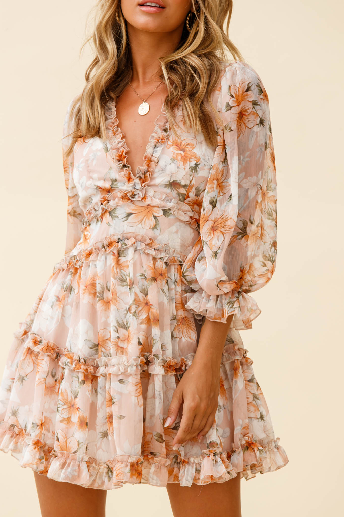 Laney Cutout Back Frill Trim Dress Hibiscus Print Nude