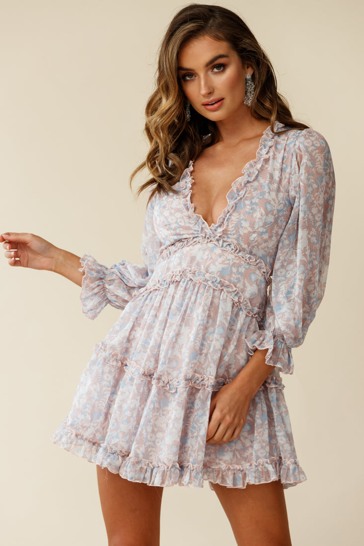 Laney Cutout Back Ruffle Trim Dress Floral Print Pink/Blue