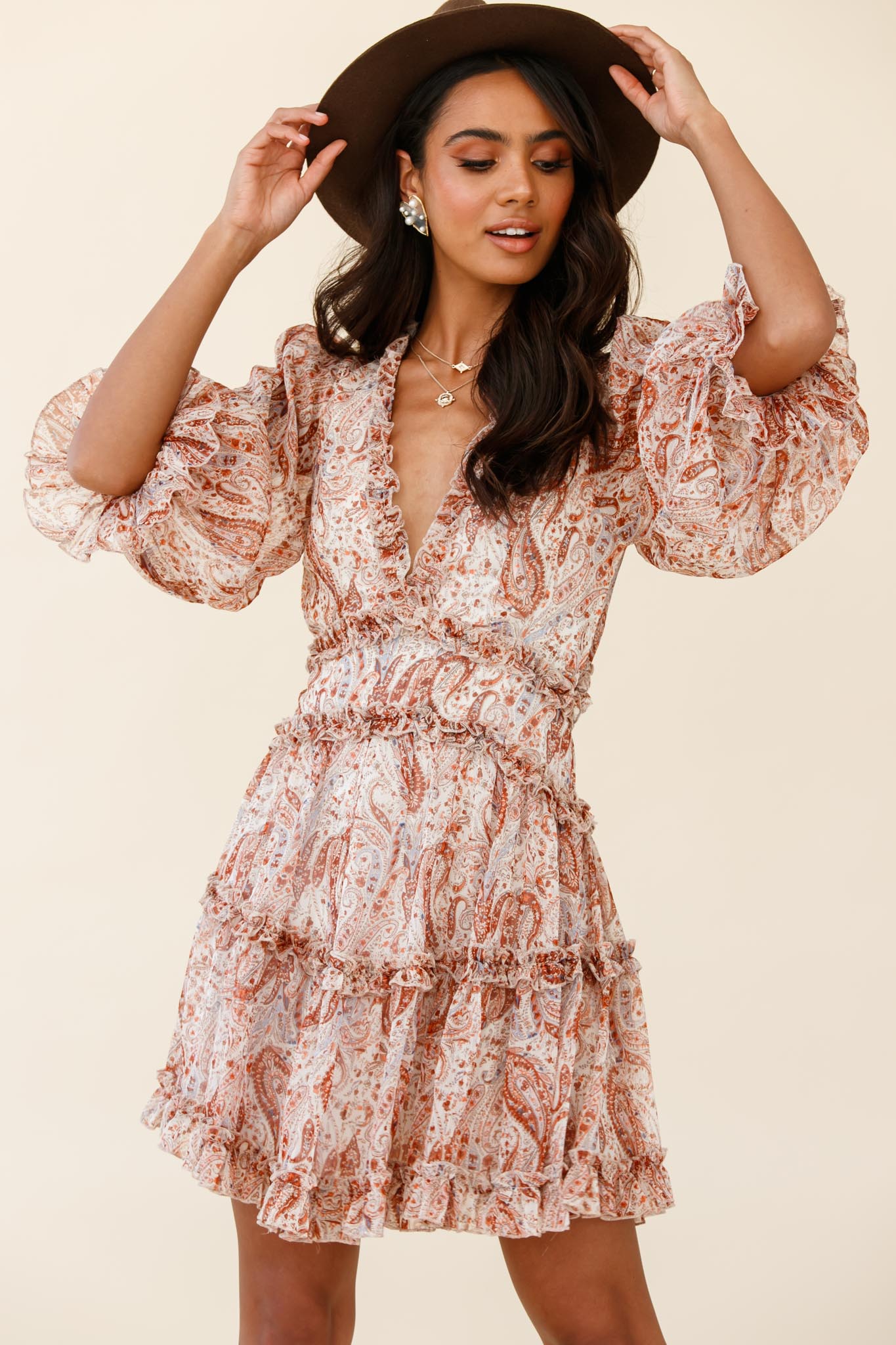 Laney Cutout Back Ruffle Trim Dress Paisley Print Rust