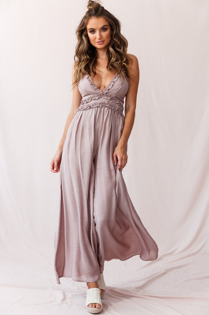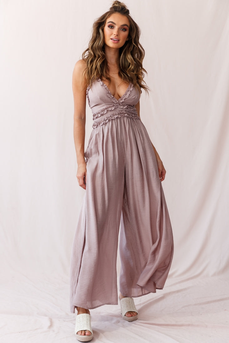 Laney. She's ALL that. And you will be too in this super cute jumpsuit featuring adjustable shoulder straps, a delicate ruffle trim around the V-neckline and torso and breezy wide-leg style. Wear it on a girls' night out with strappy nude heels or during the day to a BBQ pool party teamed with canvas wedges.
