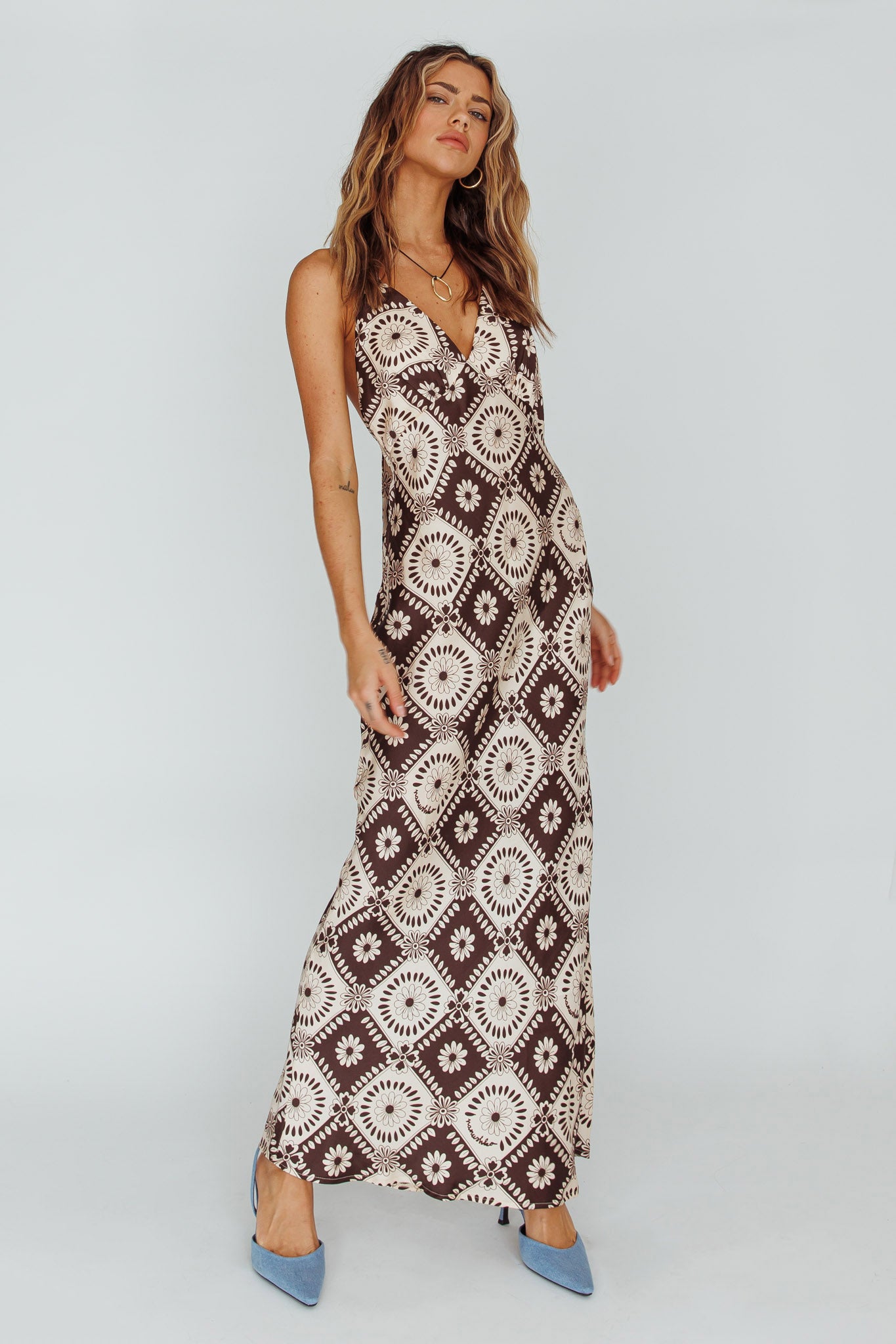 - Chocolate, floral midi dress