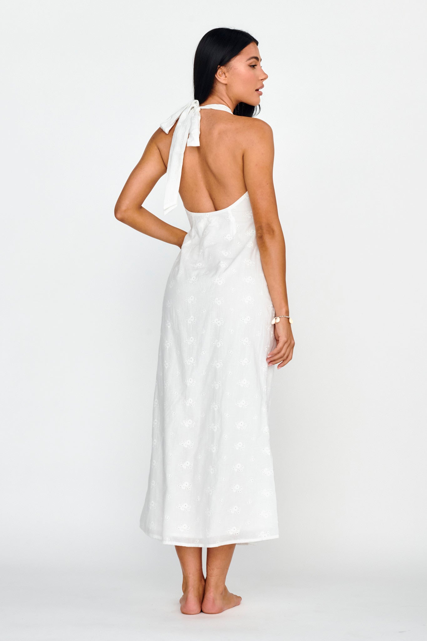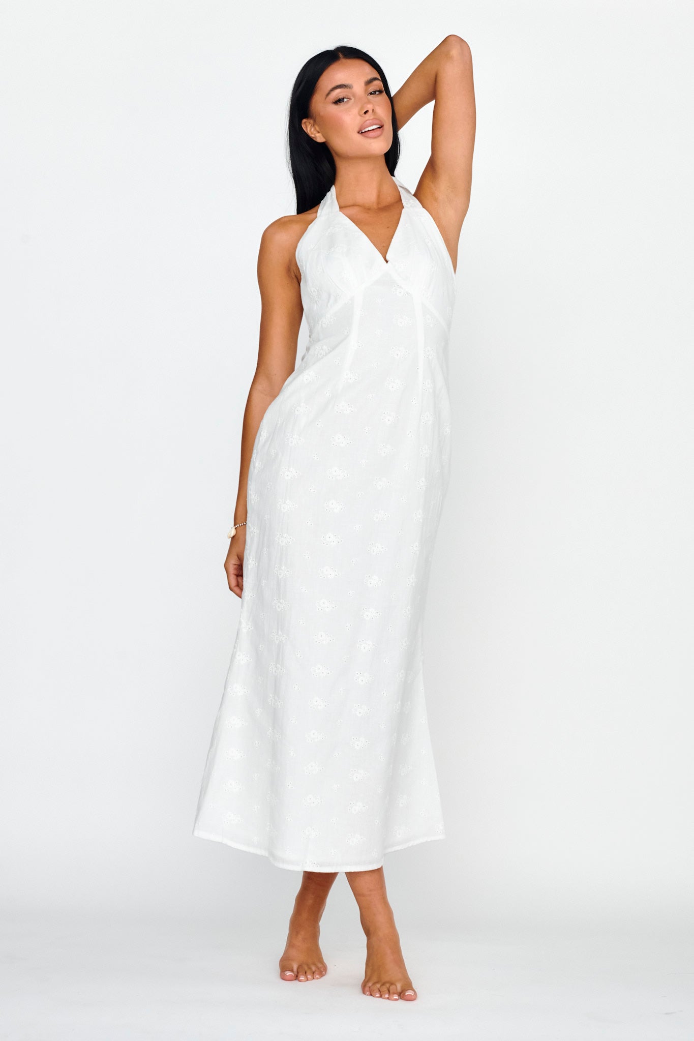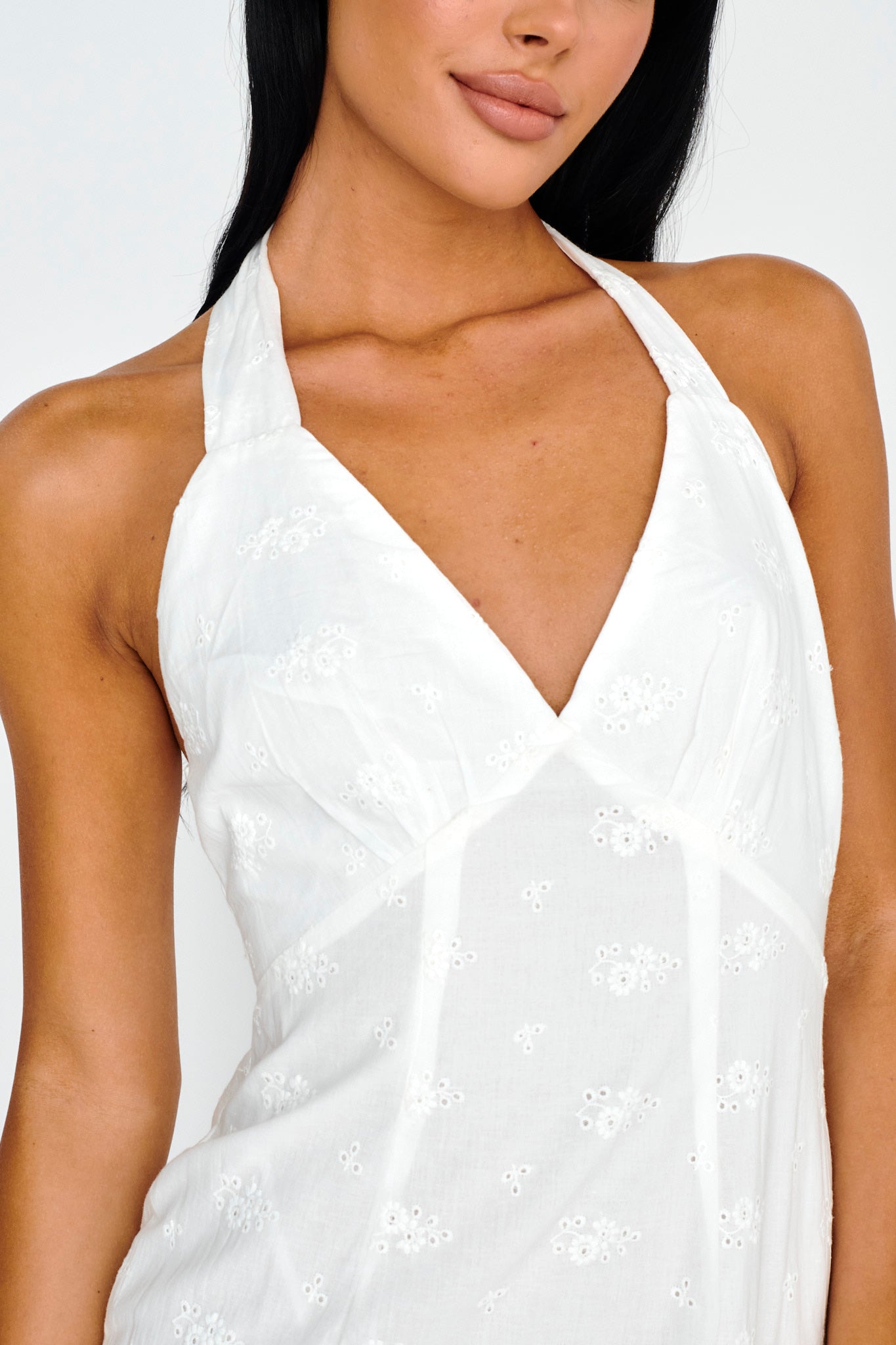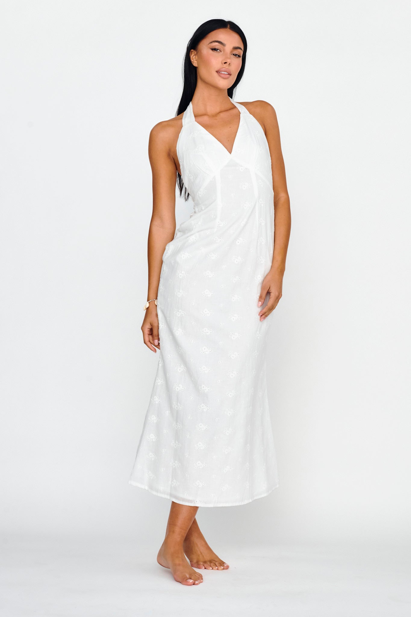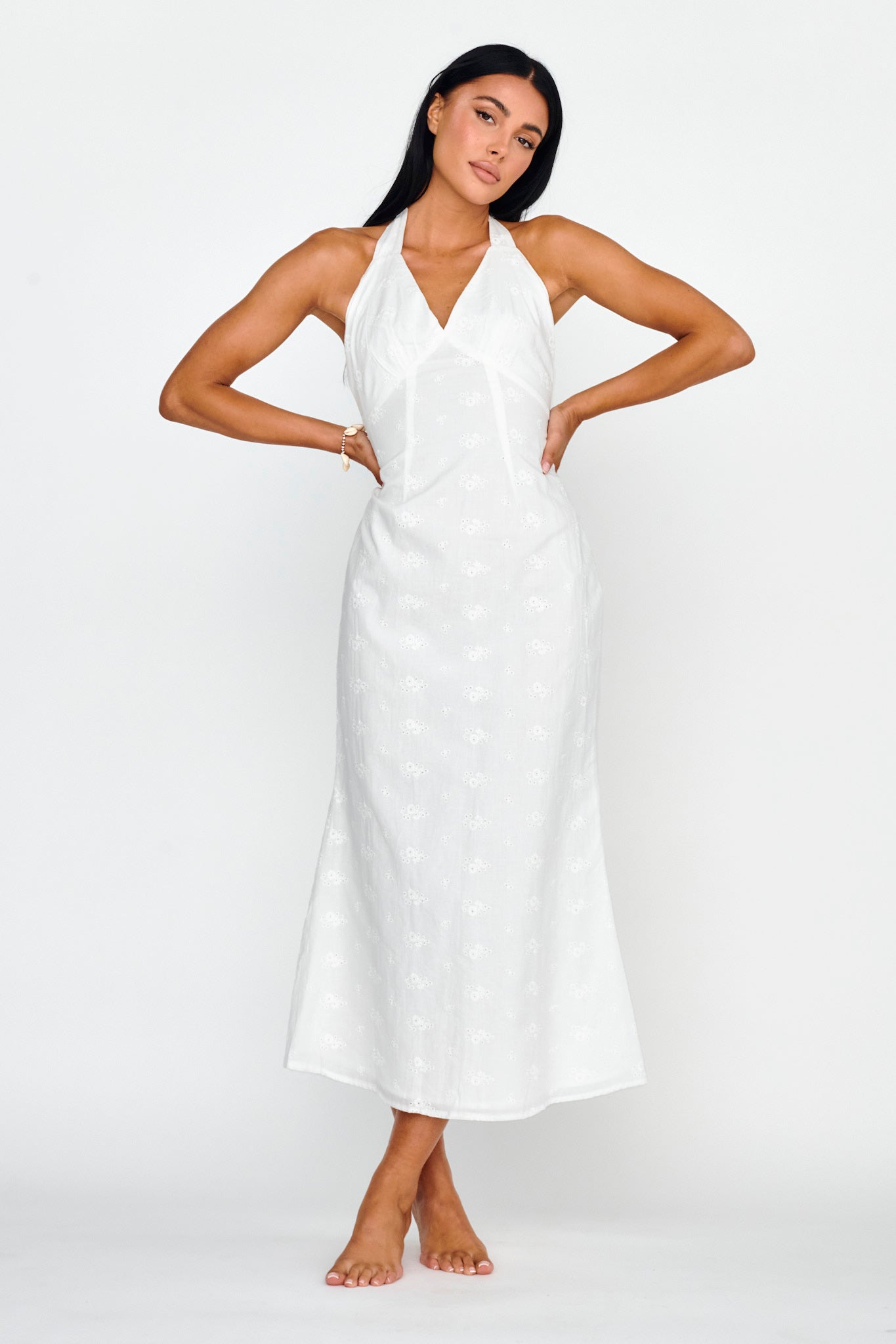 Jaws will drop when you strut by in our gorgeous Lavara midi dress. Featuring a halterneck style and pretty, eyelet embroidery. We are obsessed! Perfect for a special birthday celebration or gals' night out! Team it with a chic mini purse and strappy, tie-up heels for an unforgettable look!