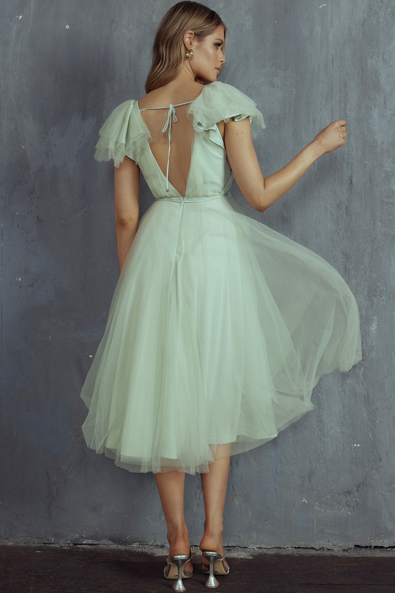 Leap Of Faith Frill Shoulder Tulle Midi Dress Pistachio