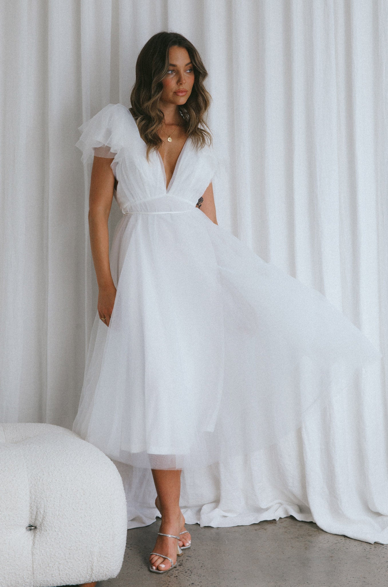 Hello, princess! You'll feel like royalty in our gorgeous Leap Of Faith midi dress. Featuring a tulle-mesh overlay that floats as you walk and pretty frill accents on the shoulders. It's perfect for bridal events or a special occasion. Team it with diamante heels and a clutch for an unforgettable look.