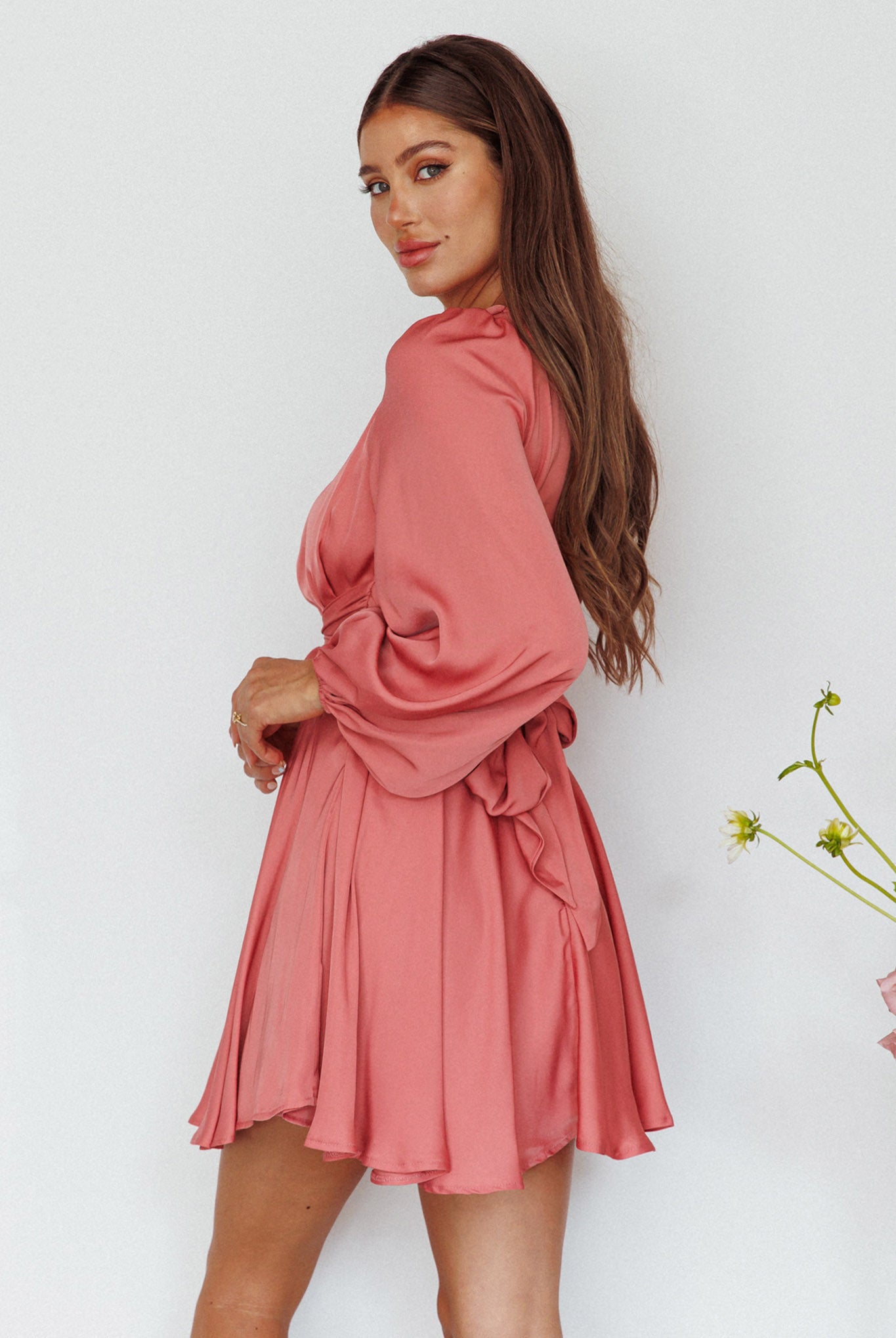 Leia Long Sleeve Waist Tie Mini Dress Rose