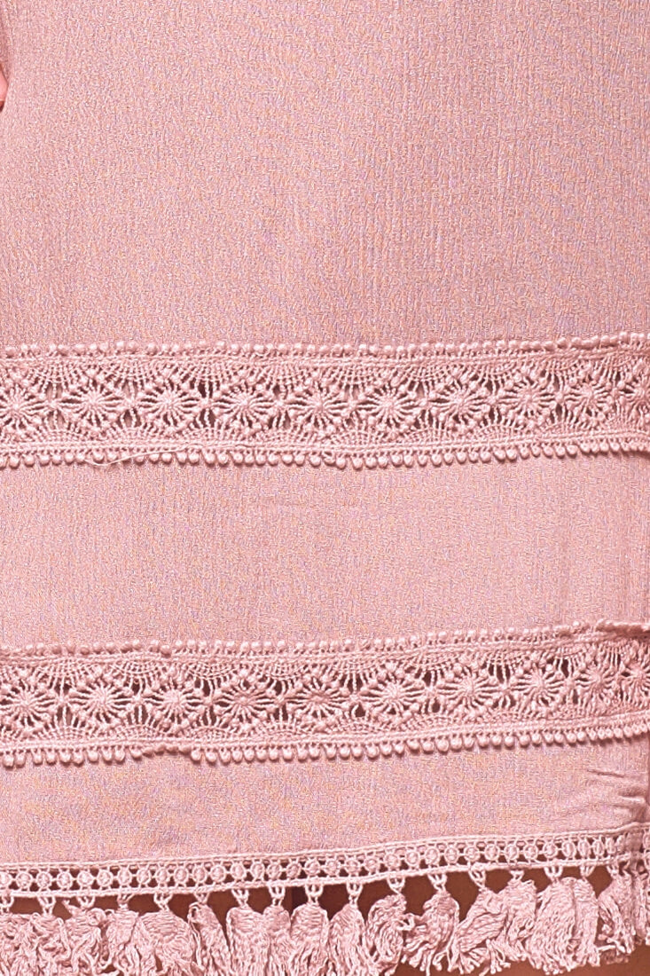 Sleeveless mocha mini dress with embroidered and frilly trim.