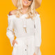 Monochromatic never looked this good! Bell sleeves are accentuated with the little ruffle detail at the end of the sleeves. Pair with your favorite heeled boots!