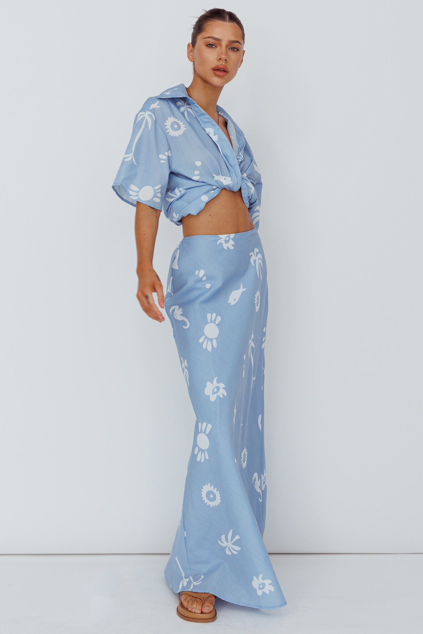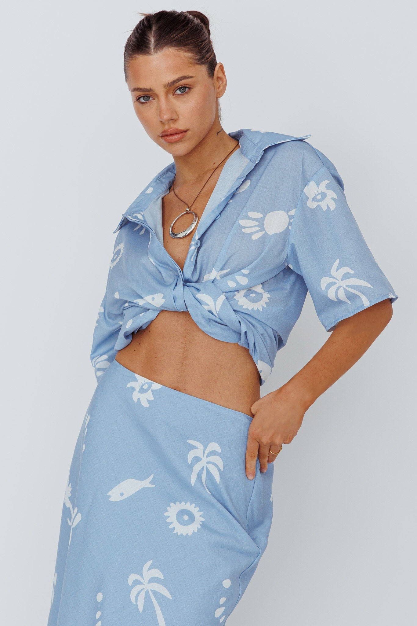 Breeze through your weekend in our chic Light Aura shirt. We are in love with its beachy print and relaxed fit! Whether it's brunch with your girls or running errands, this shirt has you covered. Team it with its matching skirt and mules for a sophisticated look.