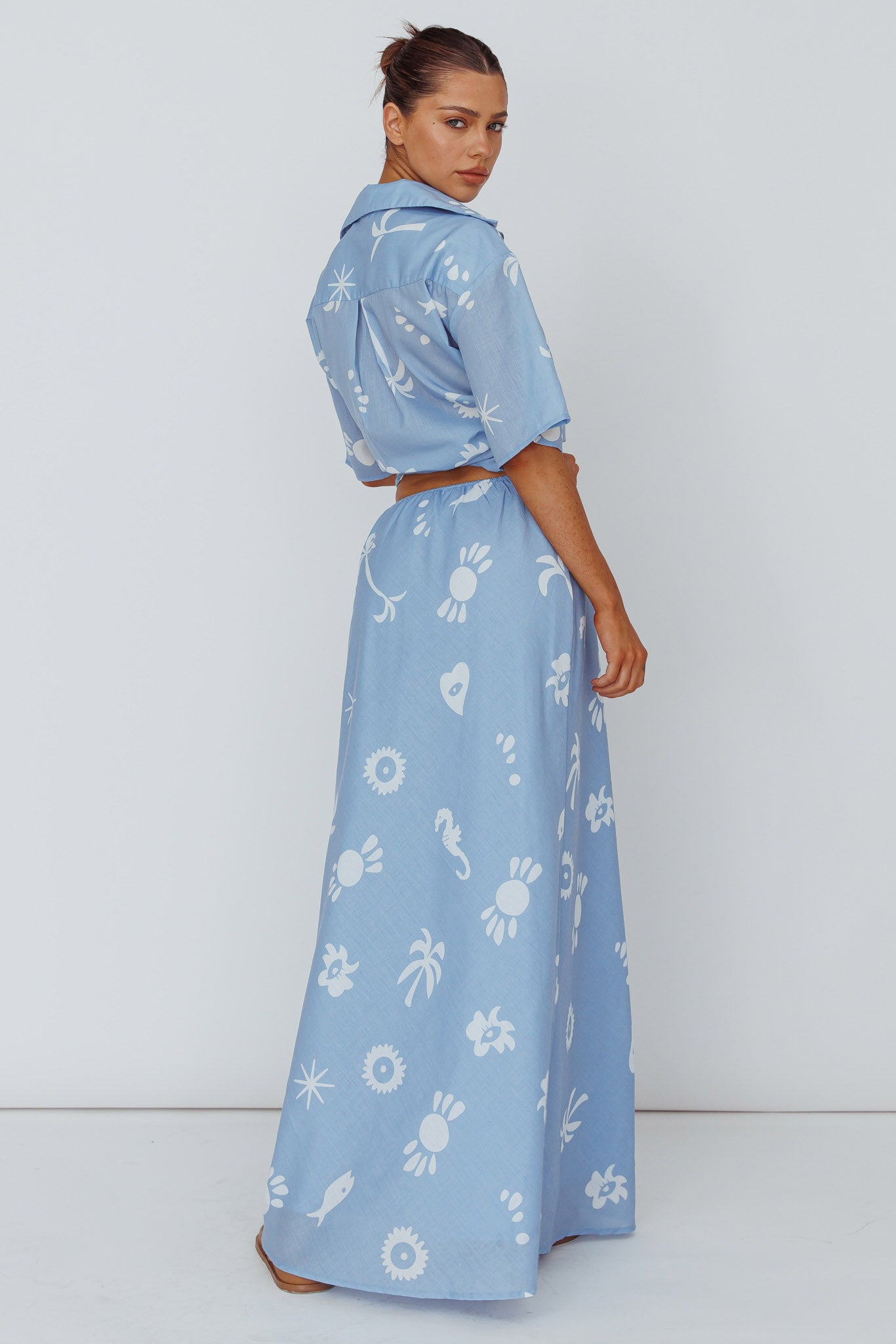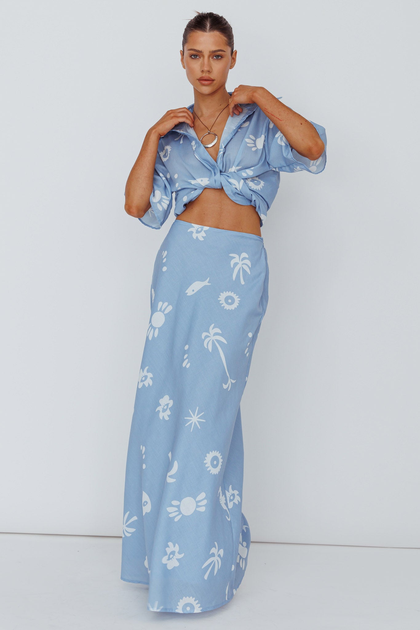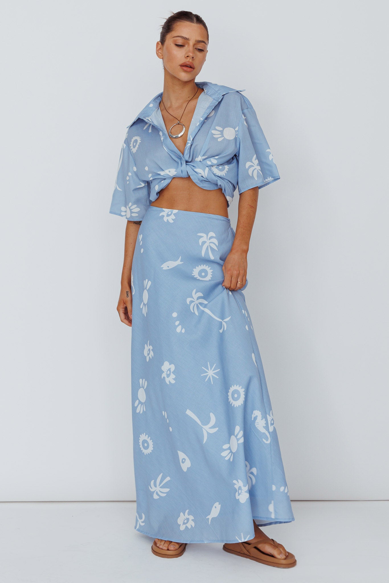 Breeze through your weekend in our chic Light Aura skirt. We are in love with its beachy print and 90's silhouette! Whether it's brunch with your girls or running errands, this skirt has you covered. Team it with its matching shirt and mules for a sophisticated look.