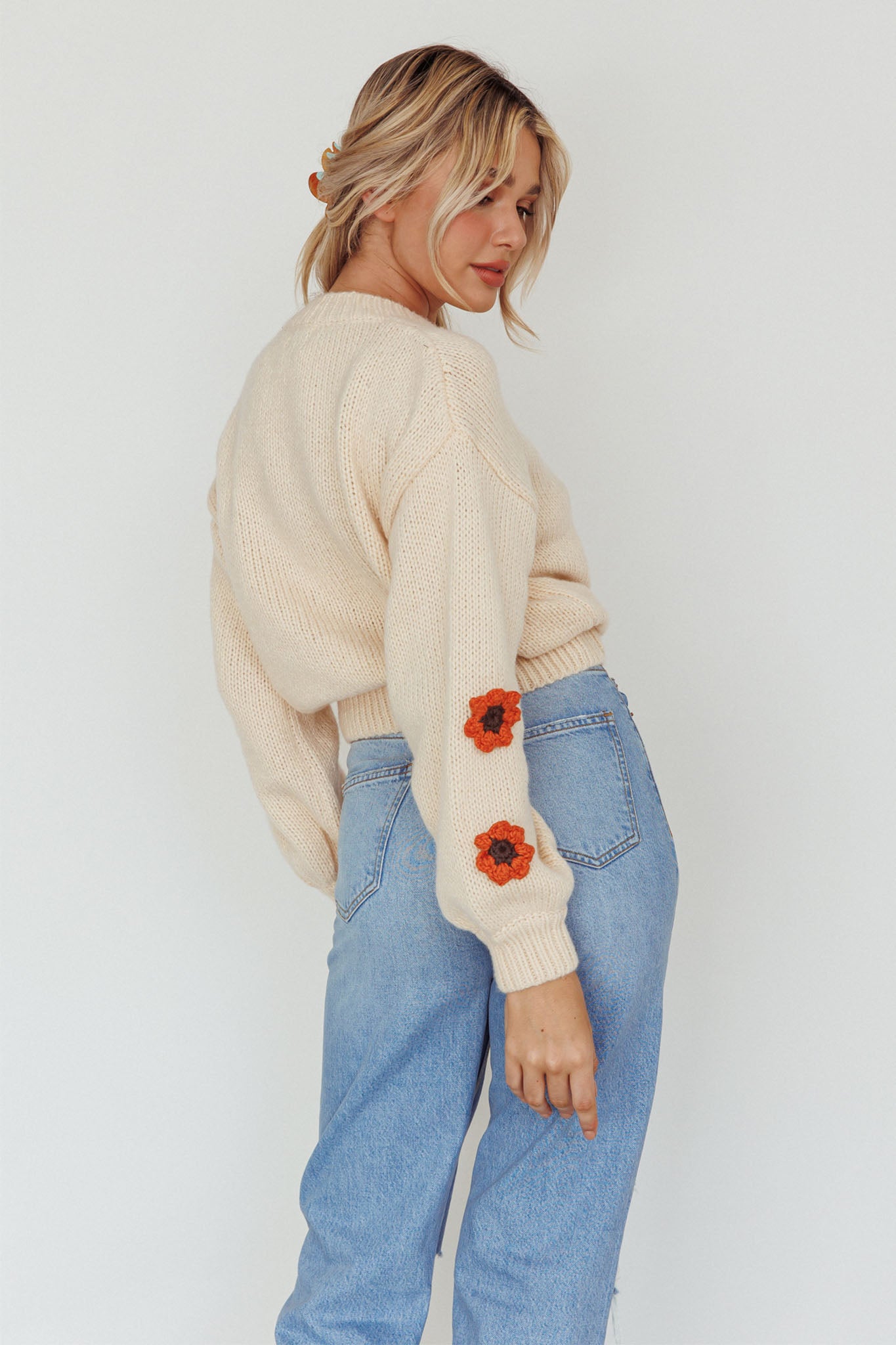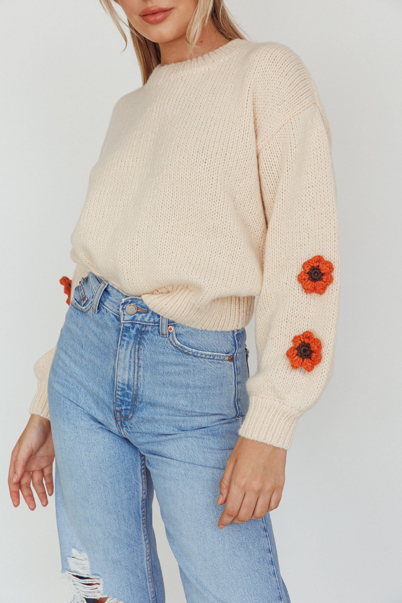 Cozy up in our super cute Lighthouse sweater. We are in love with its knit flower detail on the sleeves. Perfect for coffee dates with your girls teamed with wide leg jeans and sneakers for a playful look we are loving.