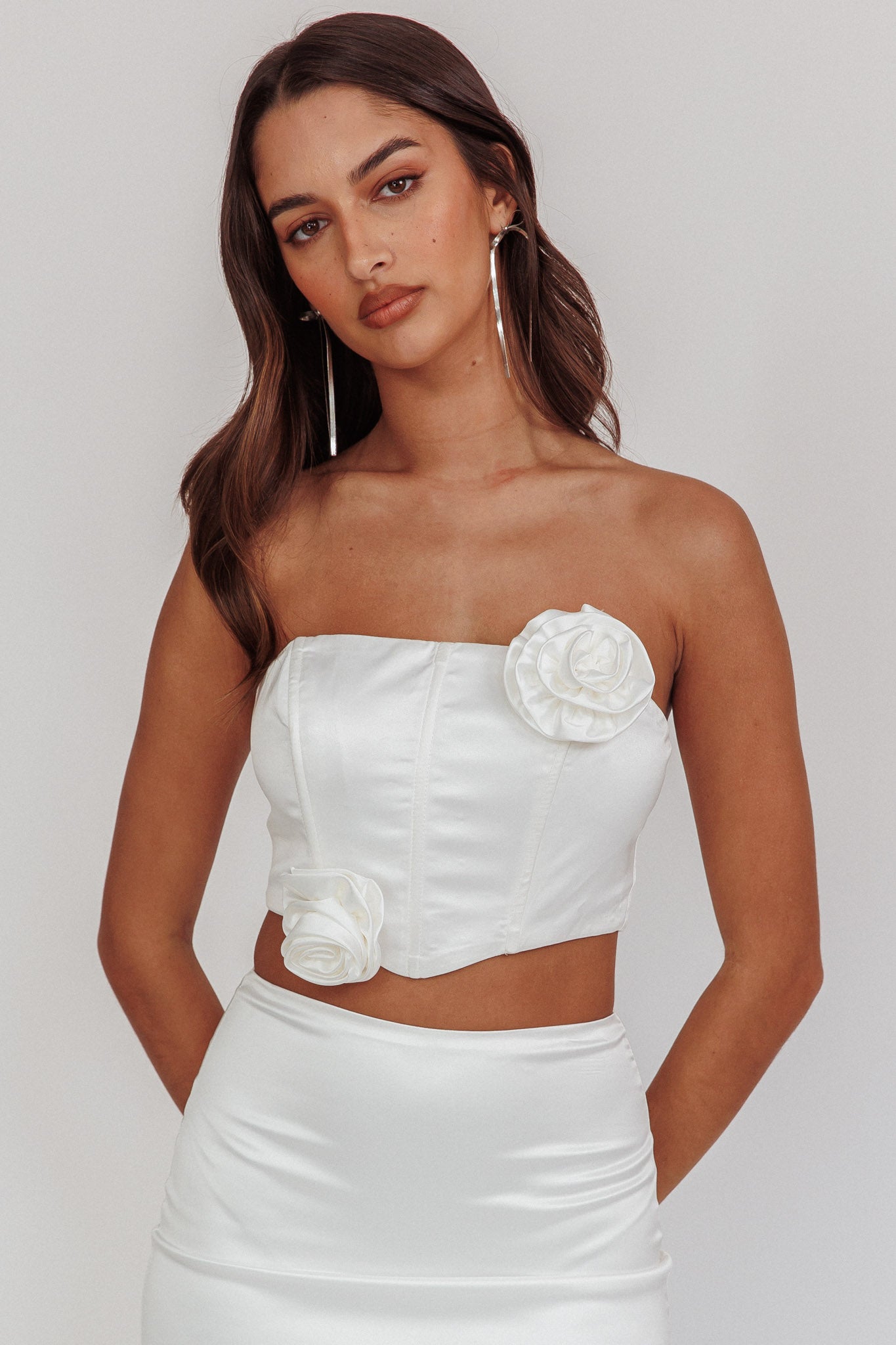 You'll have them lost for words in our gorgeous Like A Dove top. It features a strapless design and rosette details. It's perfect for bridal events or graduation! Team it with its matching skirt and nude heels for a look that will make jaws drop.
