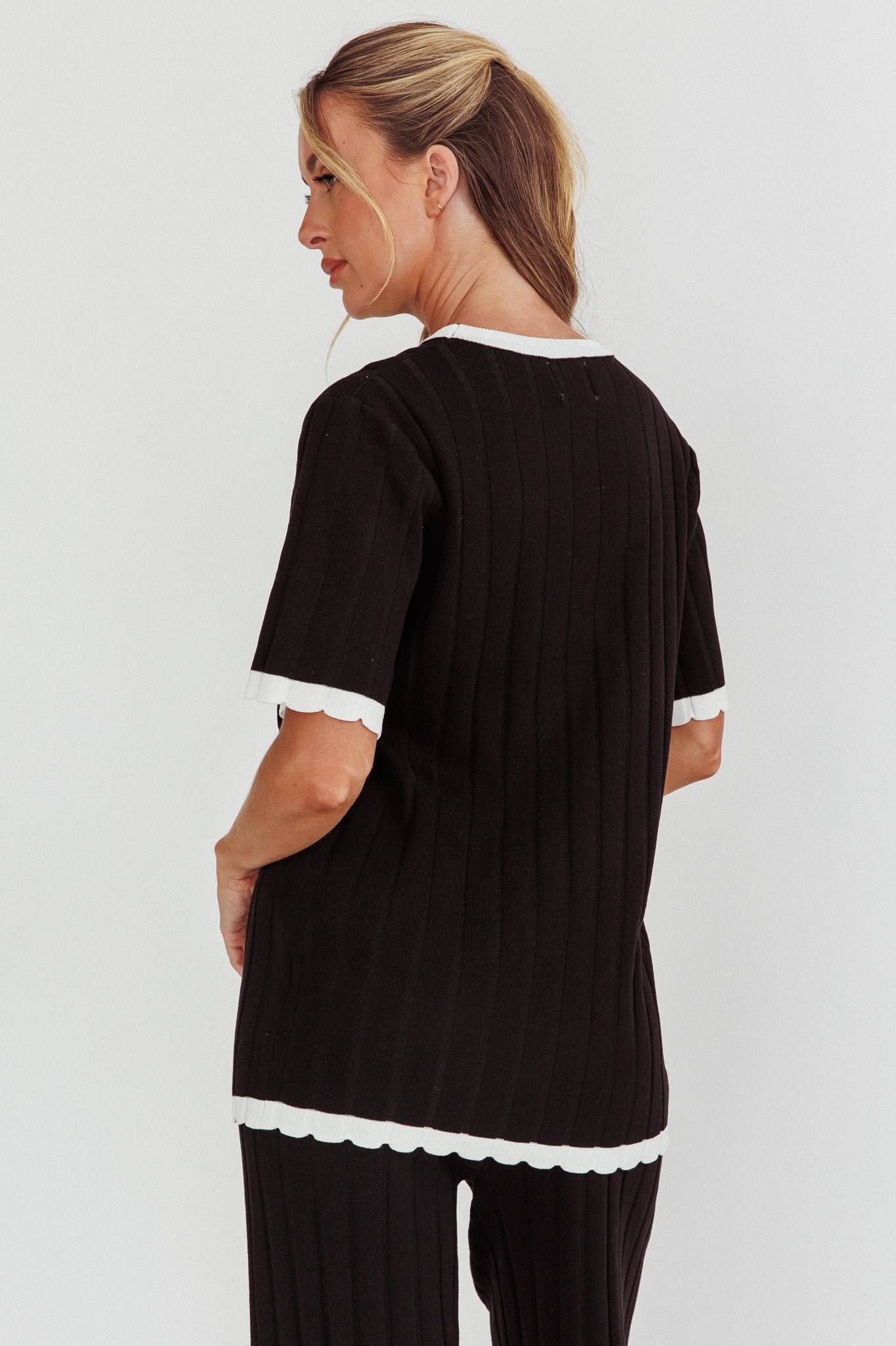 Liloh Contrast Trim Ribbed Knit Top Black