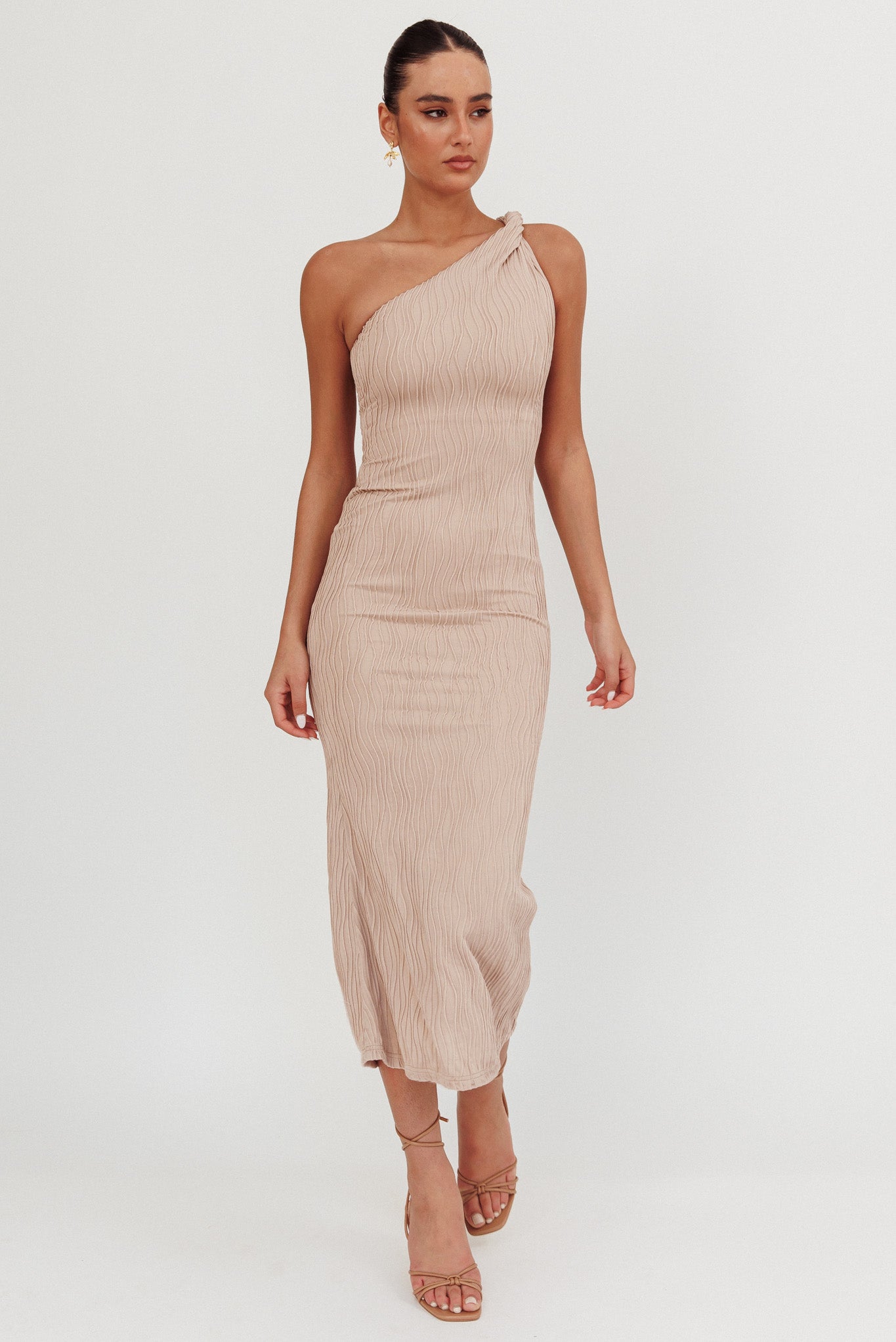 Lingering Love One-Shoulder Twist Midi Dress Beige