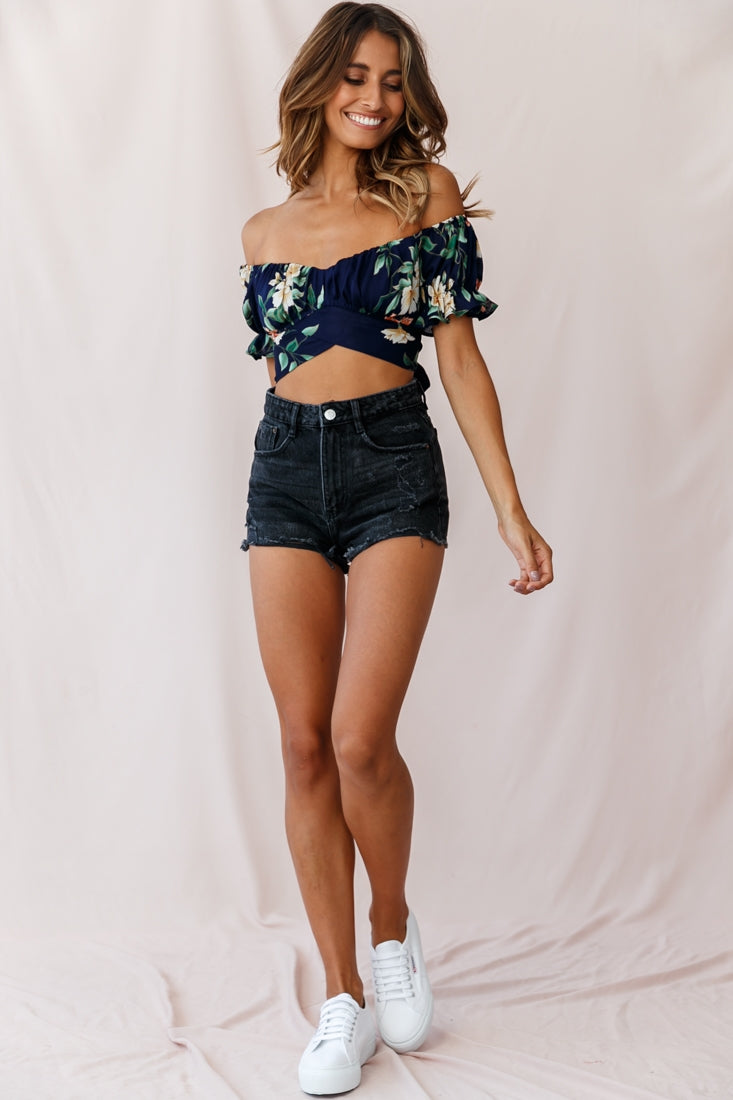 Linka Off-Shoulder Tie-Back Crop Top Floral Print Navy
