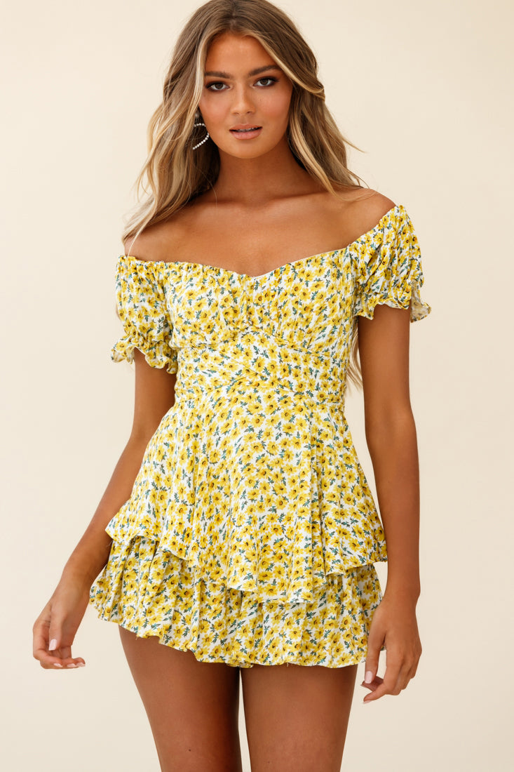 Stop what you are doing because this romper deserves a moment. Jaws will drop when you strut by in our adorable Linka Romper. Featuring an off-shoulder style and the cutest sunflower print, we're in love! Perfect for a sunny day BBQ pool party paired with canvas wedges and a wide-brim straw hat. Hello sunshine!