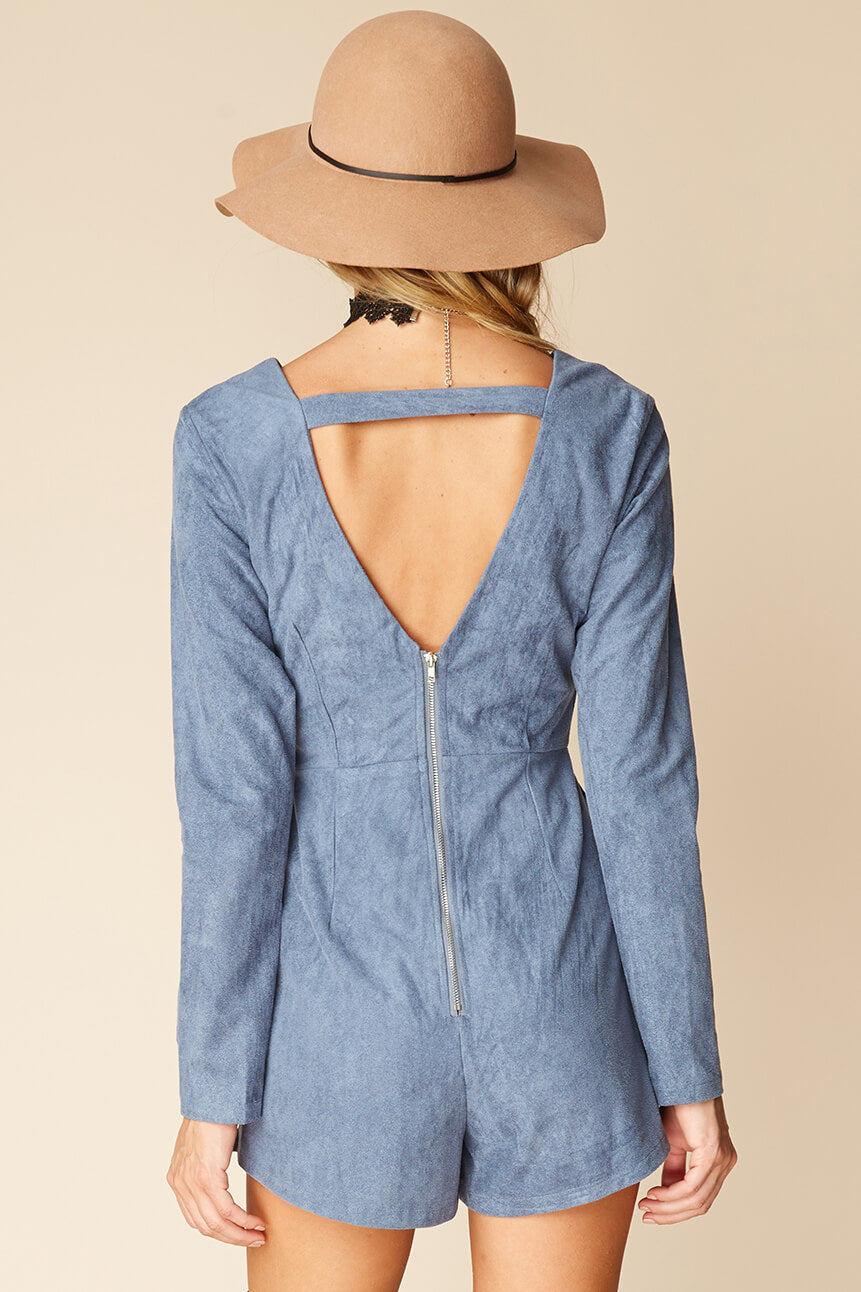This suede romper is bound to turn heads. The sleek, geometric cutout adds a lovely, new twist. Pair with brown boots.