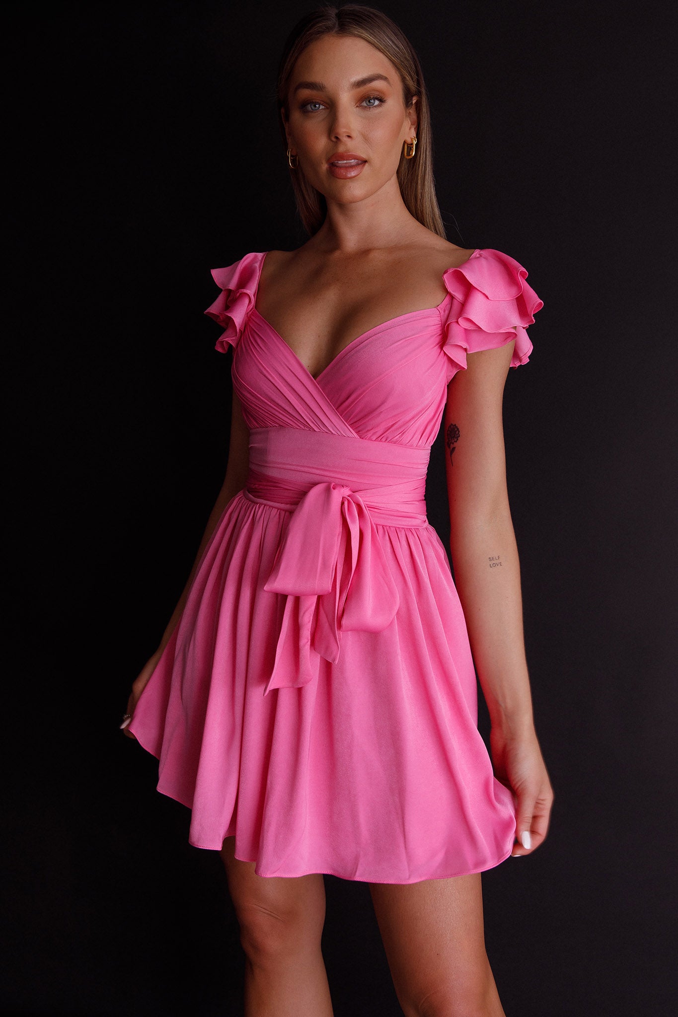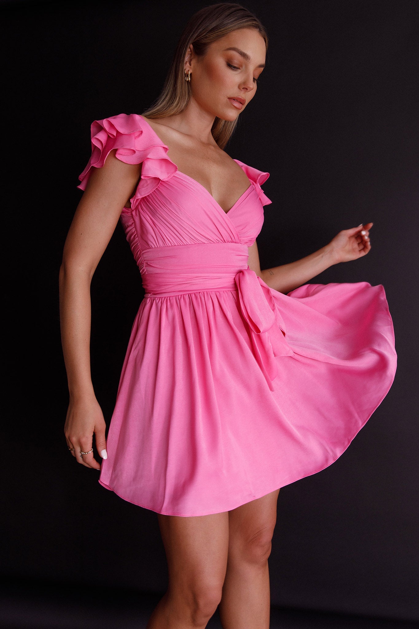 Lola Ruffle Shoulder Ruched Dress Hot Pink