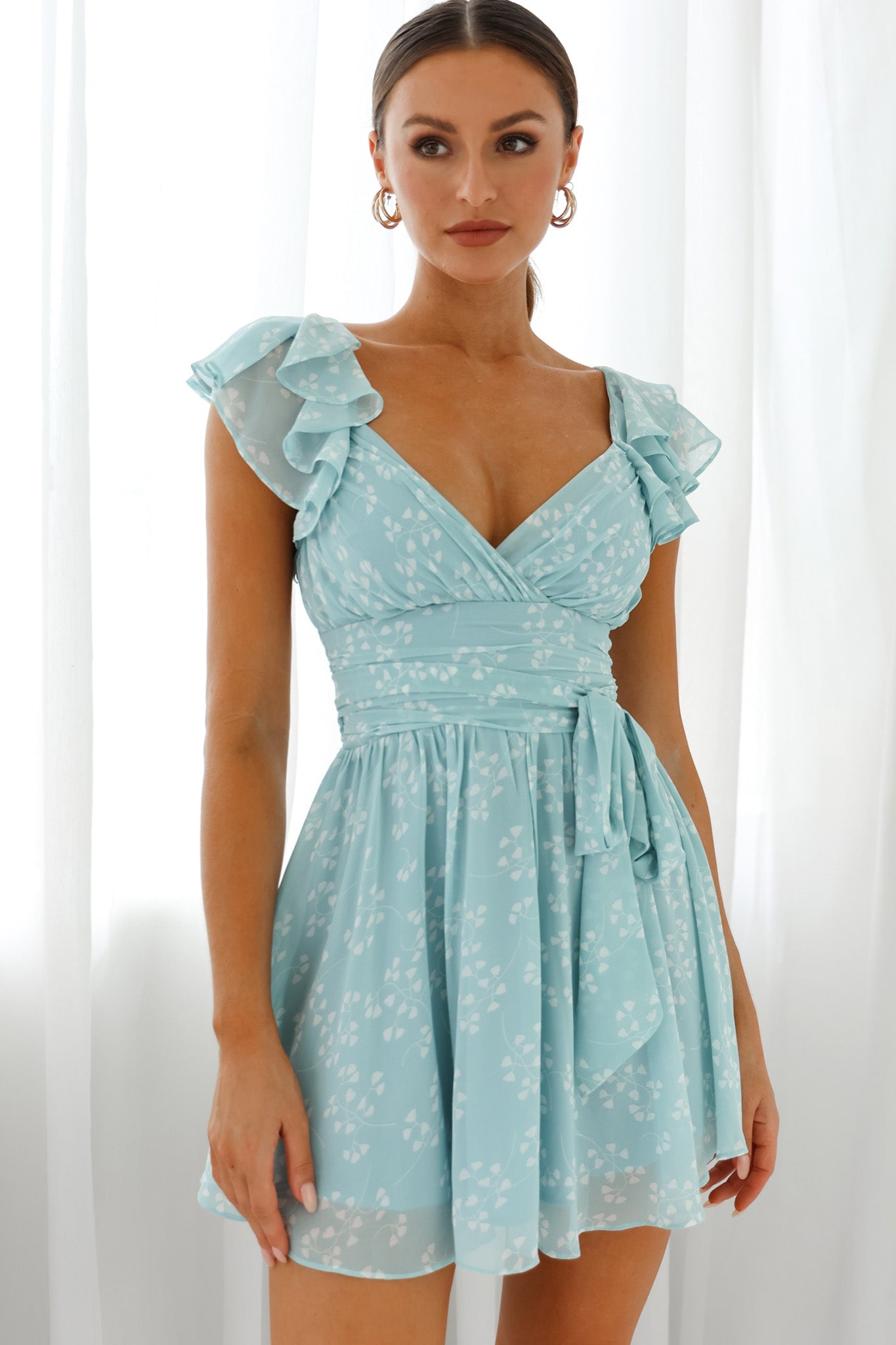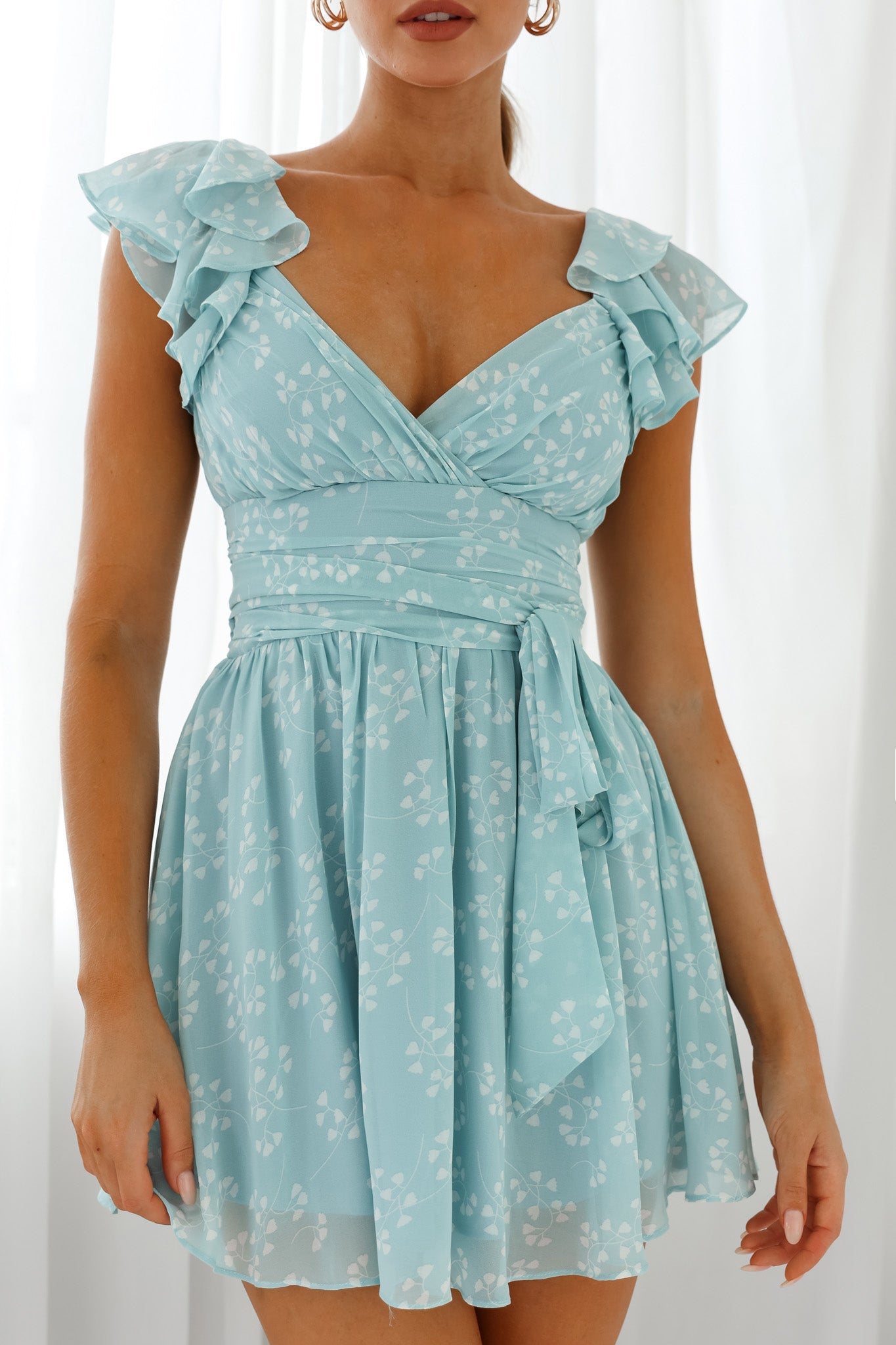 Lola Ruffle Shoulder Ruched Dress Leaf Print Blue